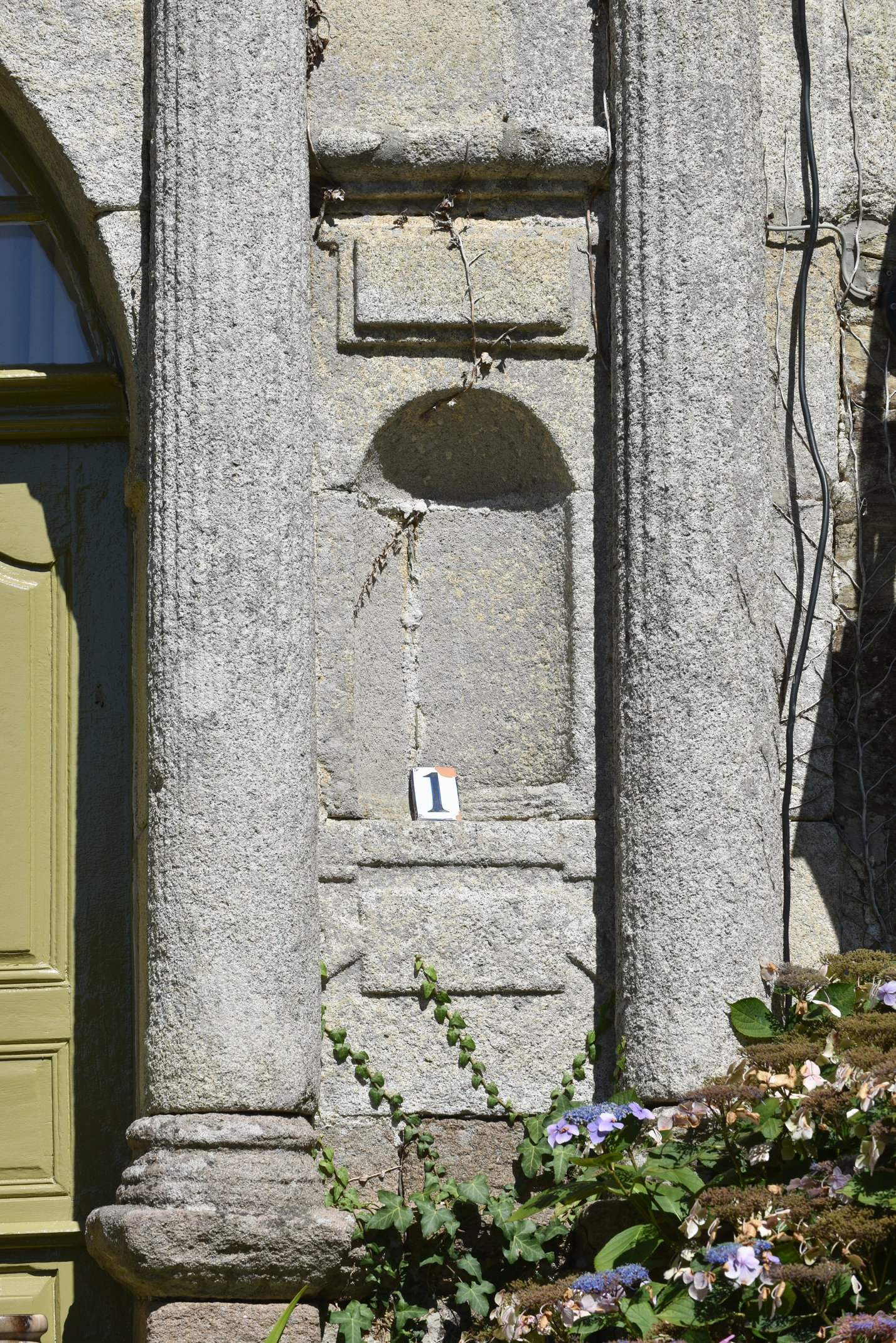 Le logis de Trostang (Camlez) - Façade sud. Portail monumental. Détail d'une niche entre deux colonnes.Immatriculation
