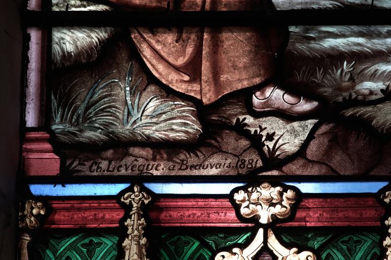 Signature de l'atelier au bas du vitrail représentant saint Louis rendant la JusticeImmatriculation