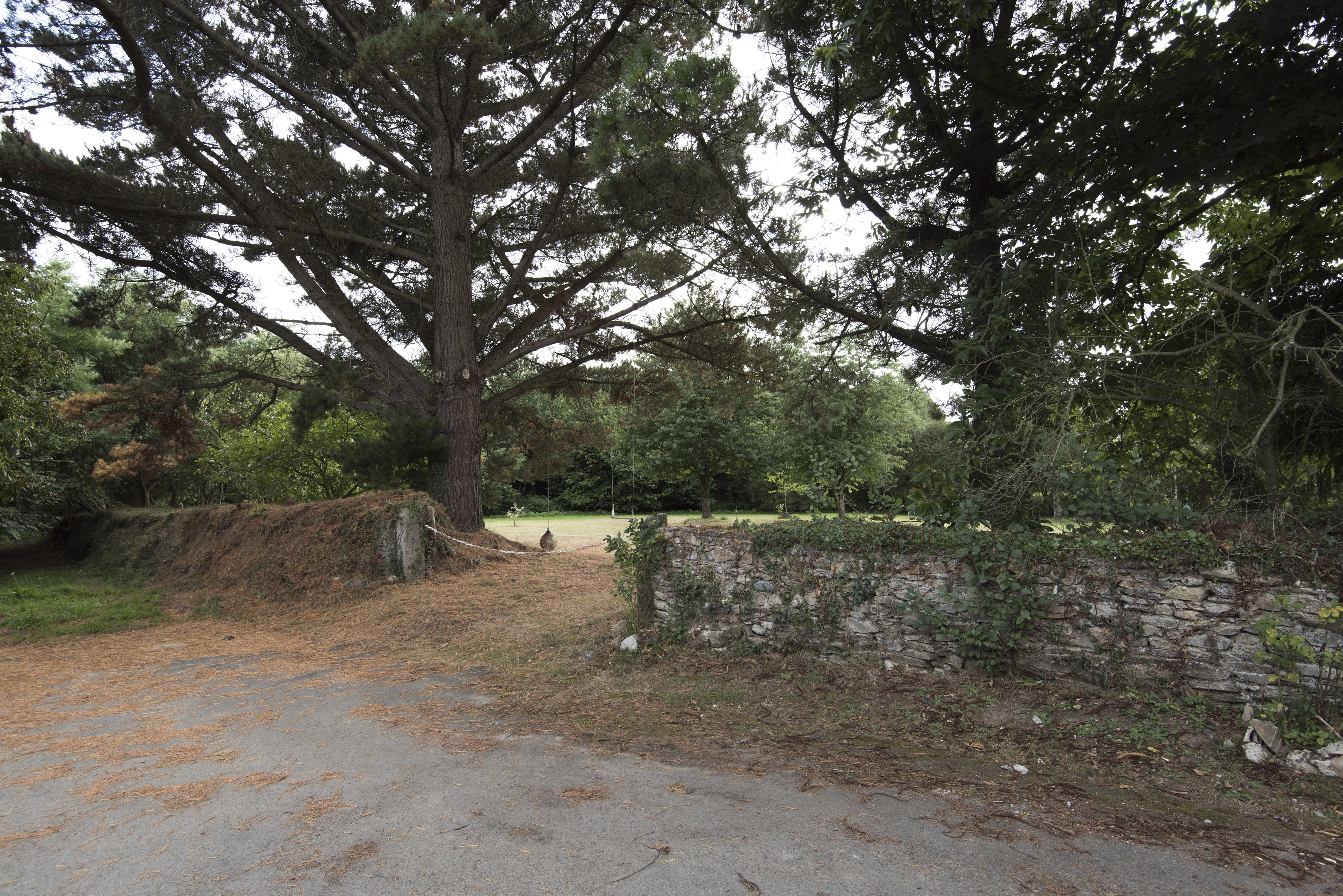 Chemin bordé d'un muret avec entrée de champs. Vue générale estImmatriculation