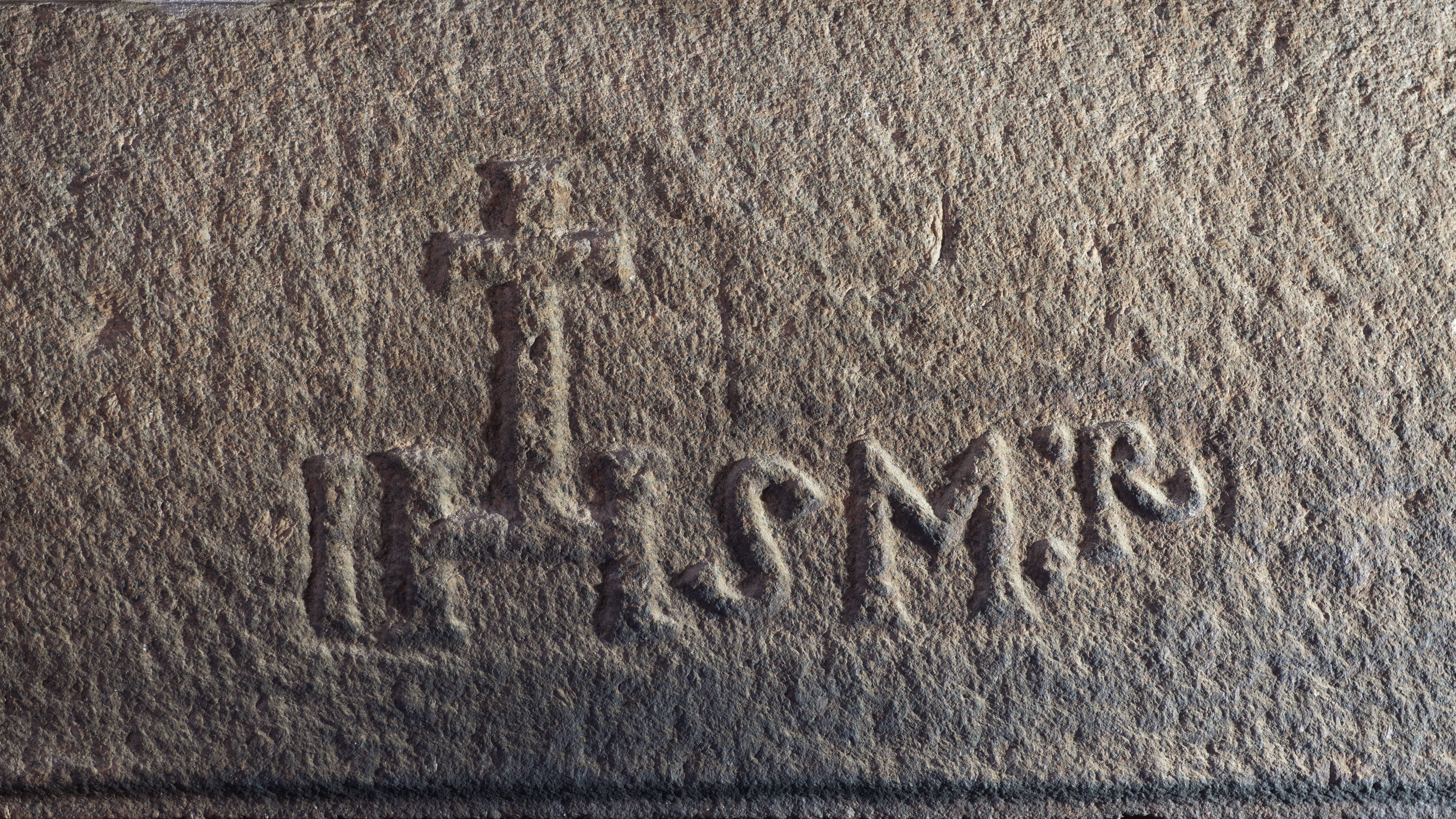 Langoat, Le Cosquer : manoir puis ferme, cheminée du logis, détail du monogramme du Christ "IH [surmonté d'ne croix] S M:r [abréviation de monseigneur]"Immatriculation