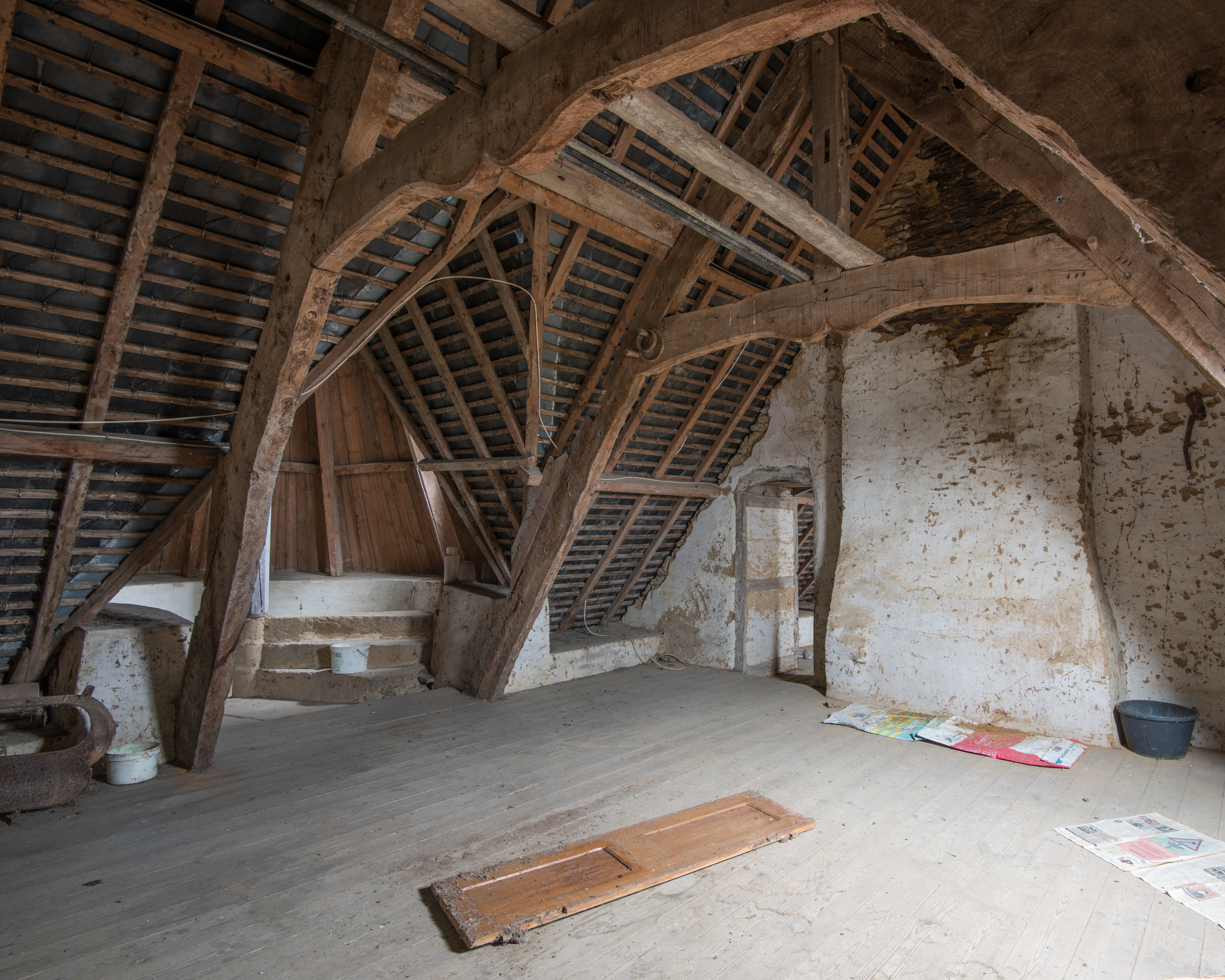 Langoat, Le Cosquer : manoir puis ferme, combles et charpente ancienne. Au débouché de l'escalier en vis, deux entraits sont ornés d'une accolade de style gothiqueImmatriculation