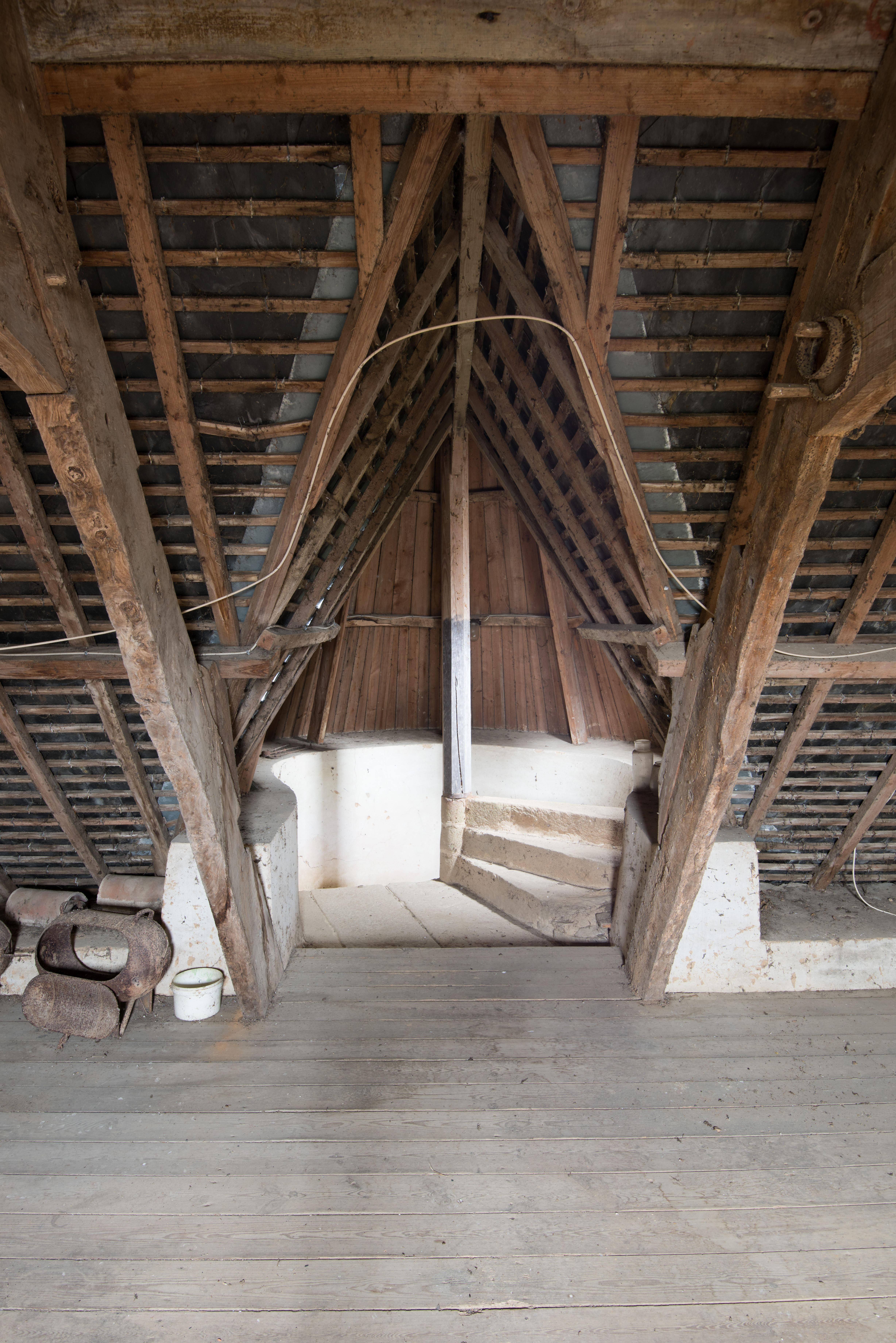 Langoat, Le Cosquer : manoir puis ferme, combles et charpente ancienne au débouché de l'escalier en vis. Les trois marches "en attente" montrent que la tour d'escalier a été en partie arasée (pièce haute disparue ?)Immatriculation