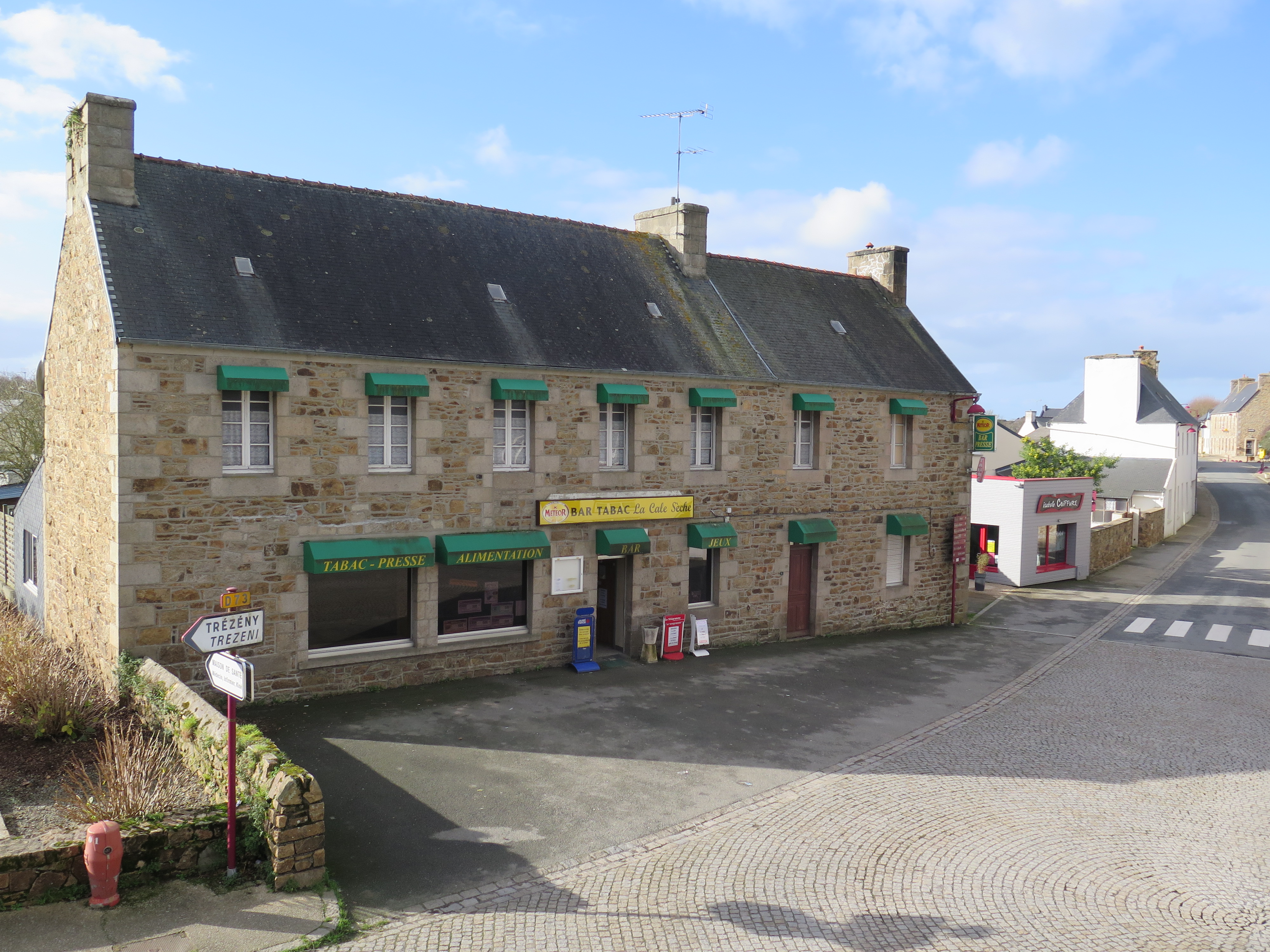 Kermaria-Sulard, le bourg : Place de l'Église, carrefour des rues de l'Église, de la Mairie et de la Croix Blanche, magasin de commerceImmatriculation