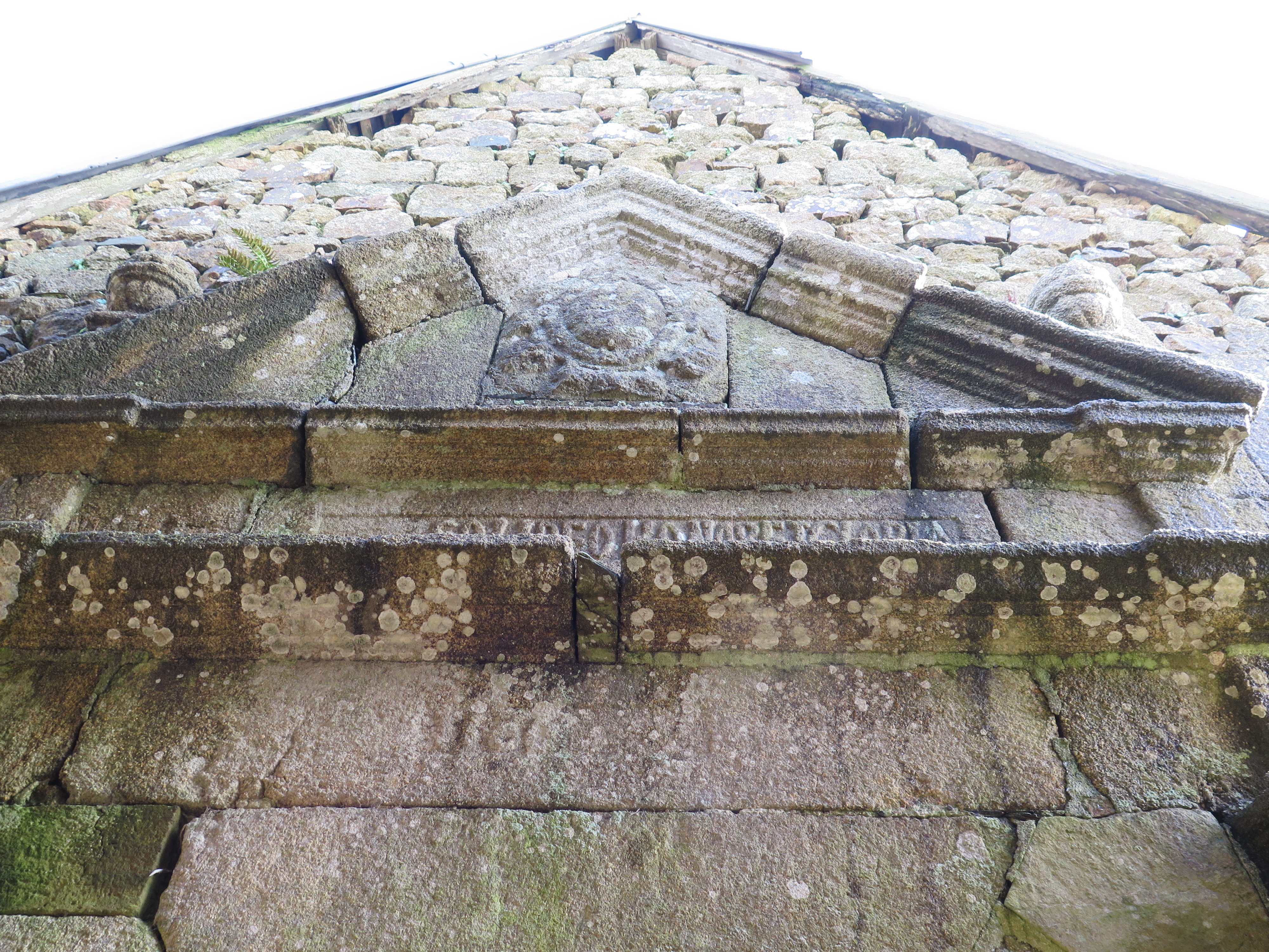 Kermaria-Sulard : chapelle de Kerleau, élévation ouest, entrée surmontée d'un fronton triangulaire et encadrée par deux colonnes (l'une d'entre elles a disparu). On peut déchiffrer l'inscription latine suivante : "SOLI DEO HONOR ET GLORIA" et le millésime 1600Immatriculation