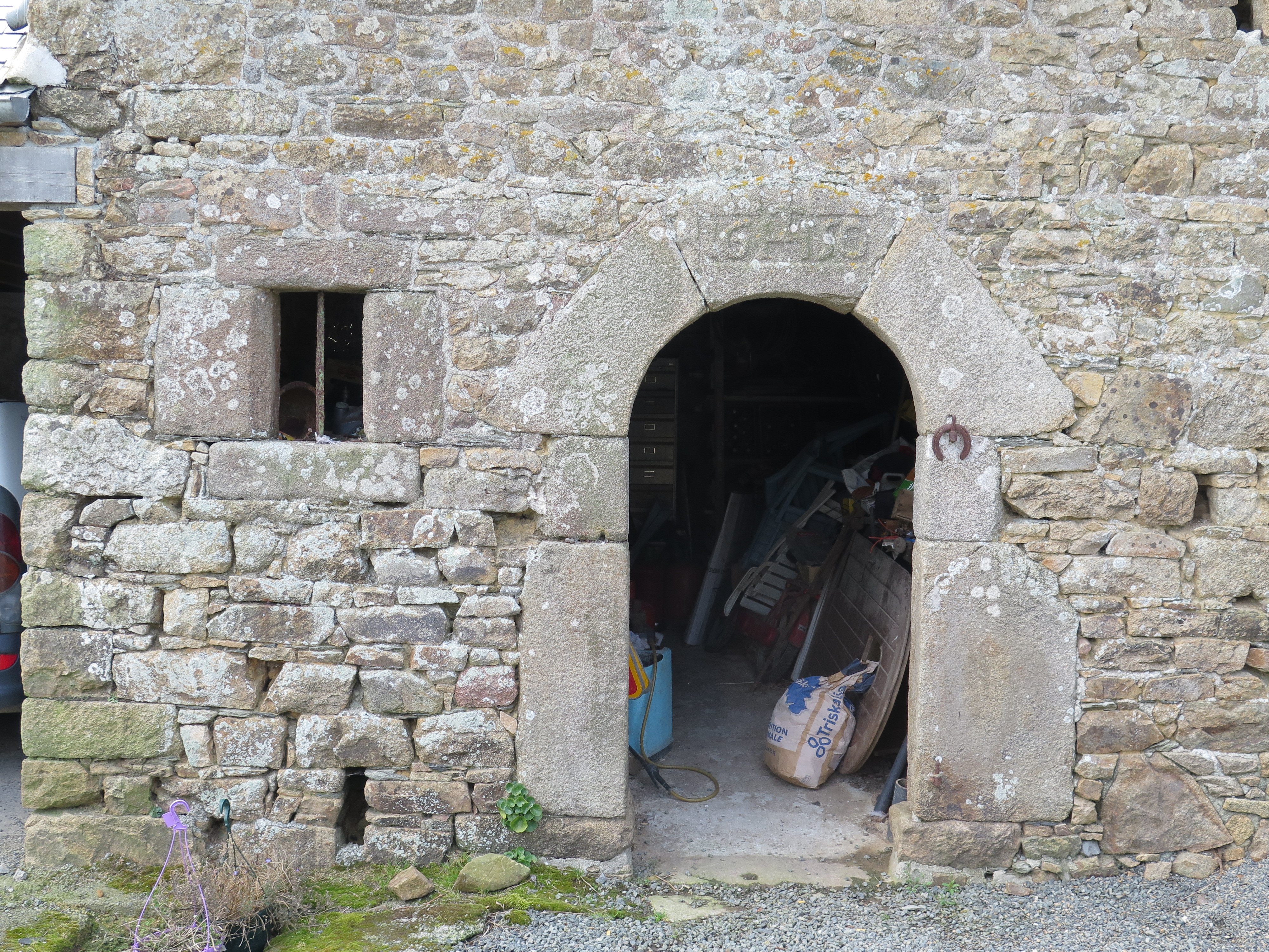Kermaria-Sulard, Prat Louët : dépendance (écurie et grange - remise), porte datée 1650 et surmontée d'un monogramme du Christ (IHS)Immatriculation