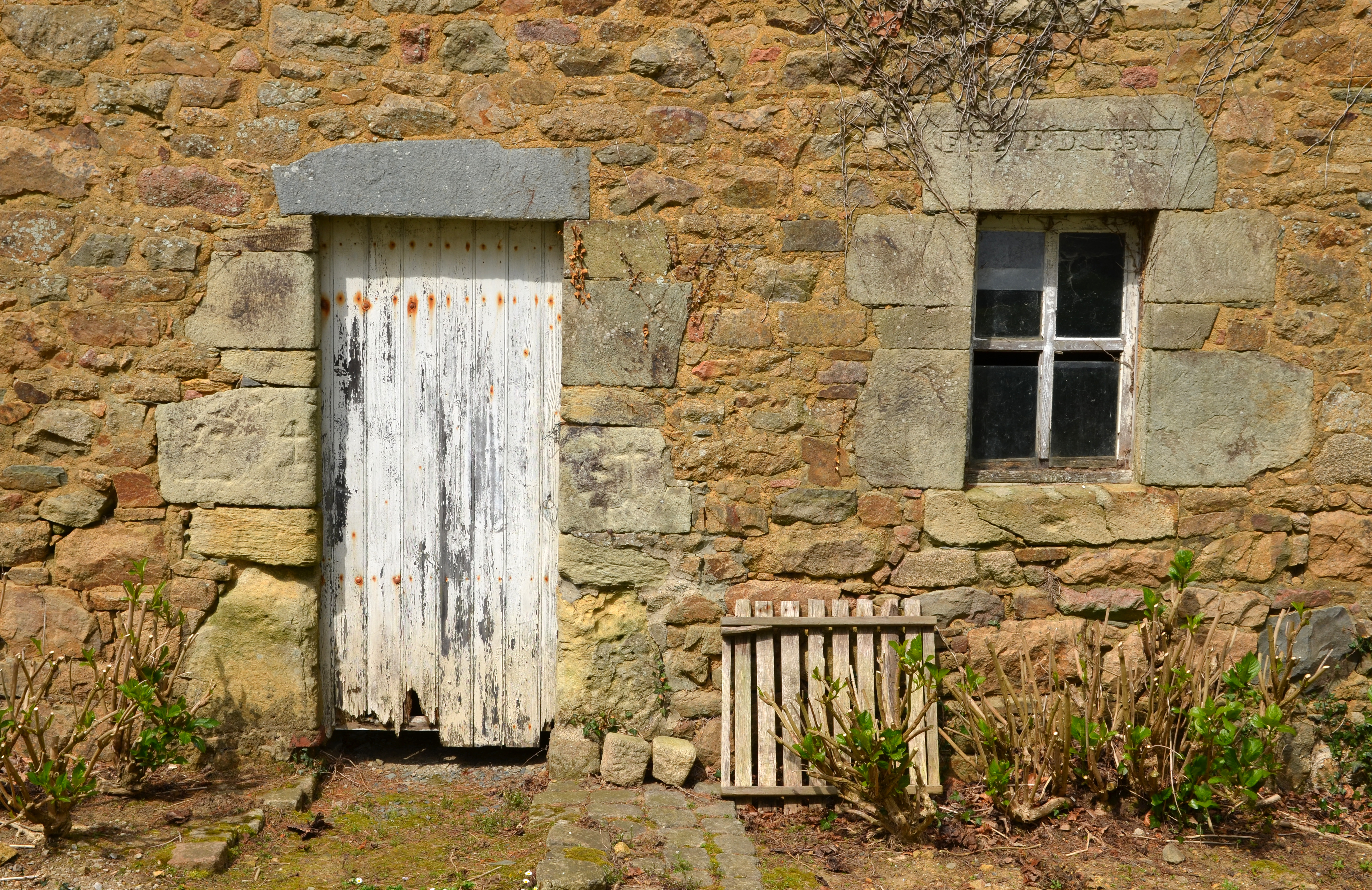 Kermaria-Sulard, Convenant Coz : logis daté de 1850 puis déclassé en étable, élévation sud, détail. Sur le linteau de fenêtre, on peut lire l'inscription suivante : "FFP FD 1850"Immatriculation