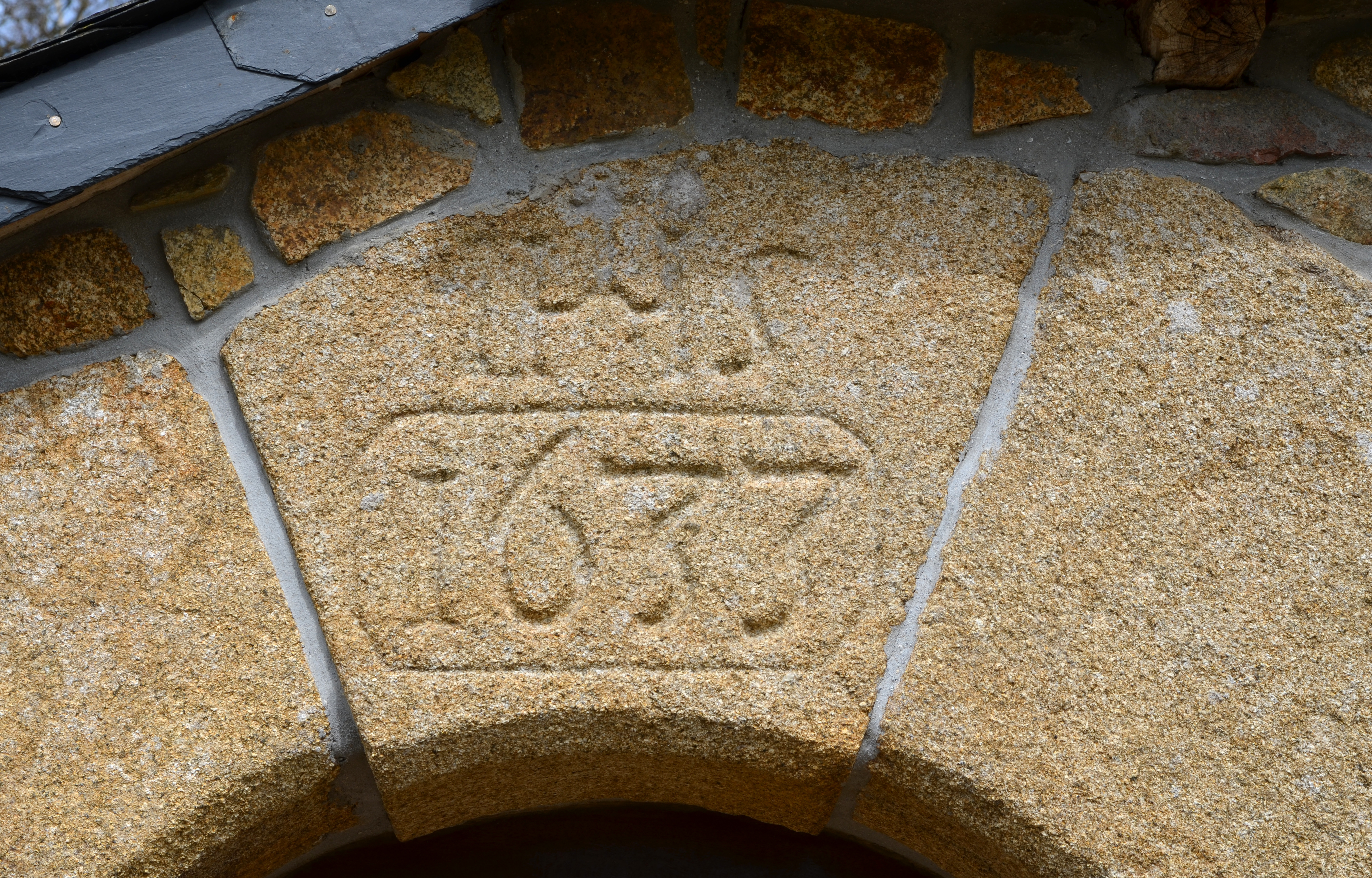 Kermaria-Sulard, Fospoul : ferme, porte datée par millésime de 1633 surmontée d'un monogramme du Christ (IHS)Immatriculation