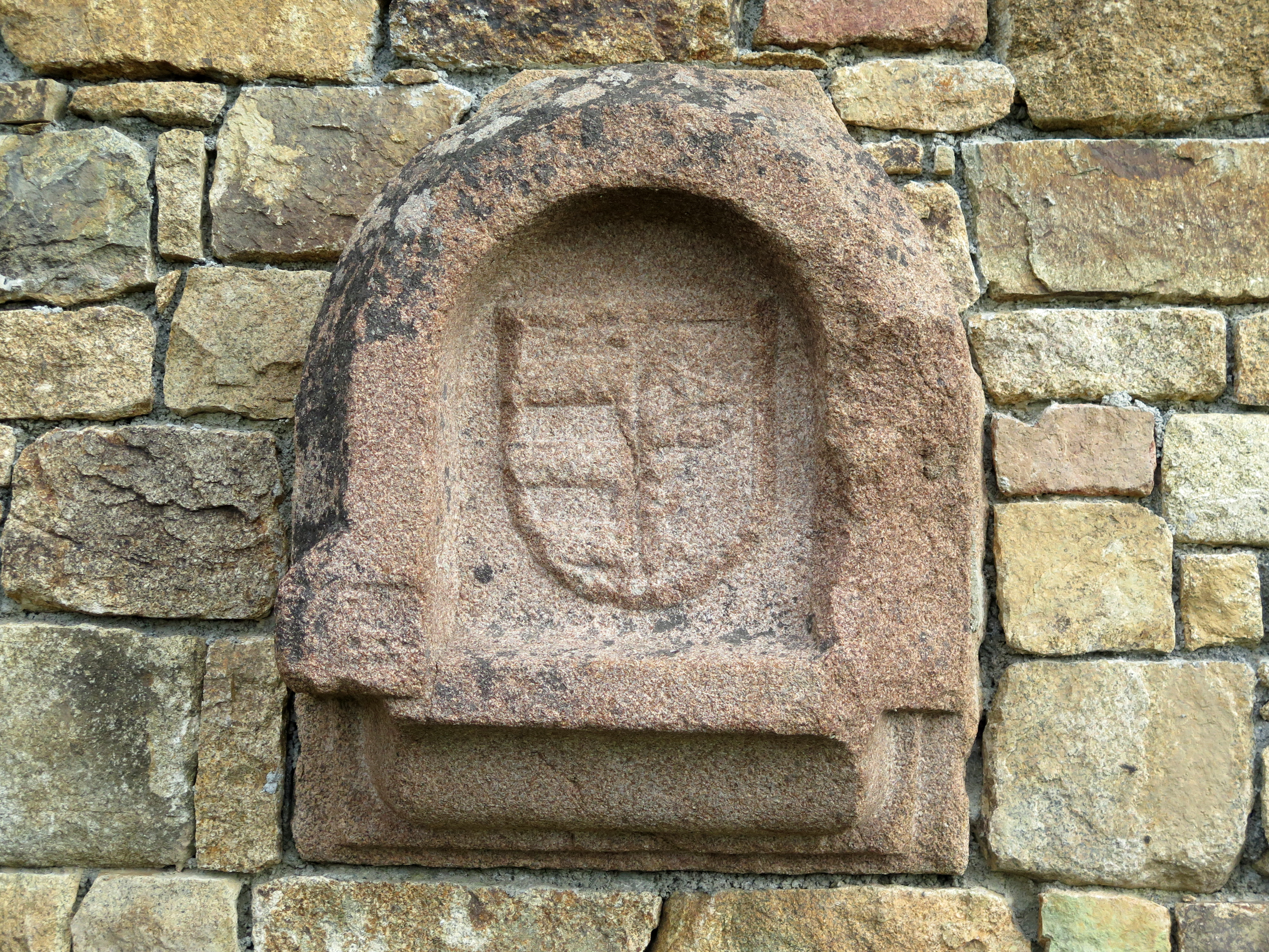 Kermaria-Sulard, Kergoff : métairie nord du château (reconstruction partielle), réutilisation des armoiries comme élément de décorImmatriculation