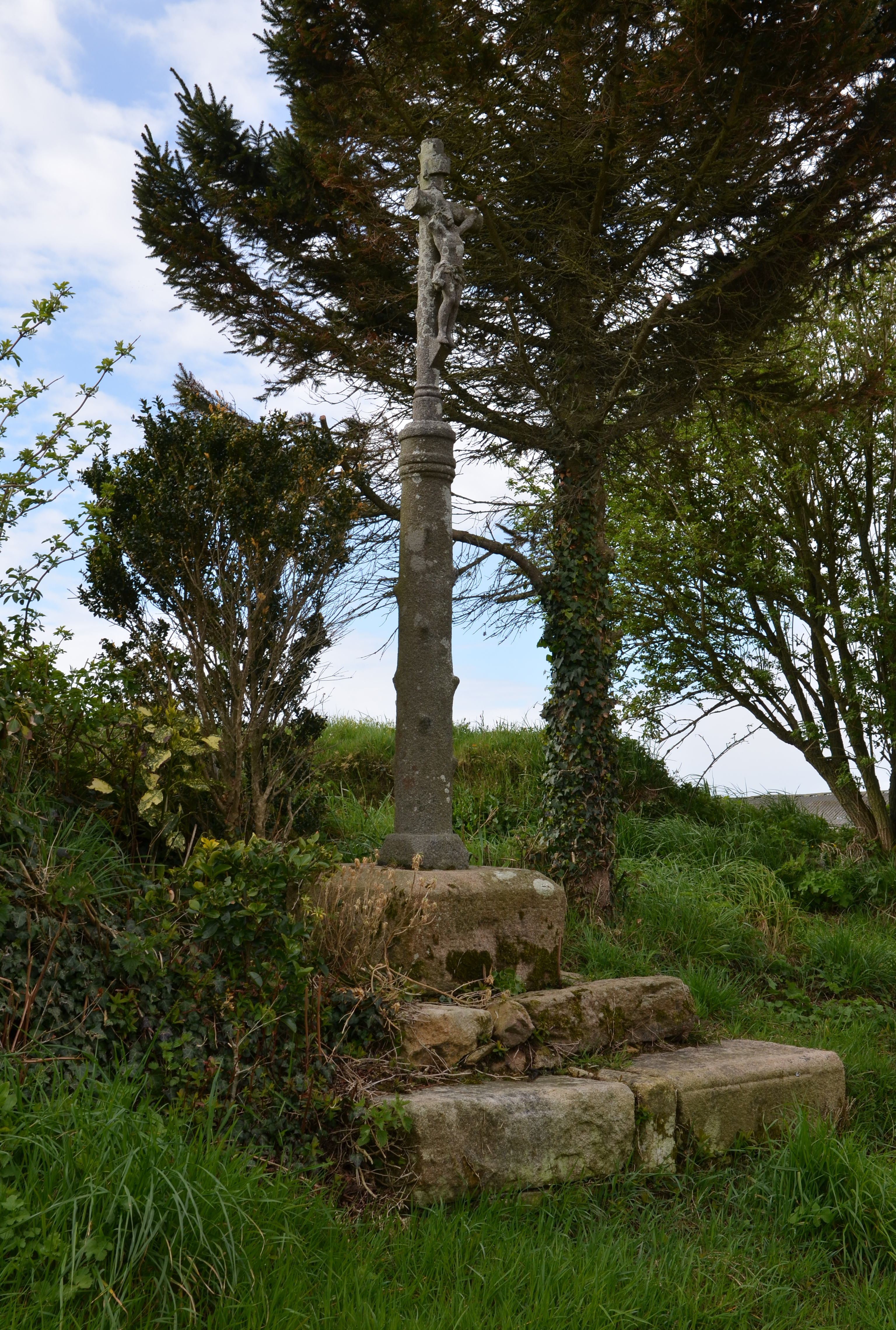 Kermaria-Sulard, carrefour de Porz Bodiou et du chemin de Kerdaniou : croix de chemin dite "Croix Rallec" (2e moitié 19e siècle). On peut lire l'inscription "LANNION LEMEUR" sur le fûtImmatriculation