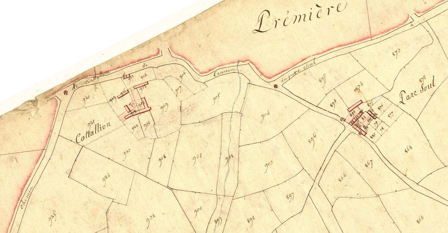 Extrait du cadastre ancien de la commune Kermaria-Sulard, 1819 : Parc Soul, Cotalliou [Coatalliou] et emplacement de la croix de Coatalliou (à l'ouest)Immatriculation