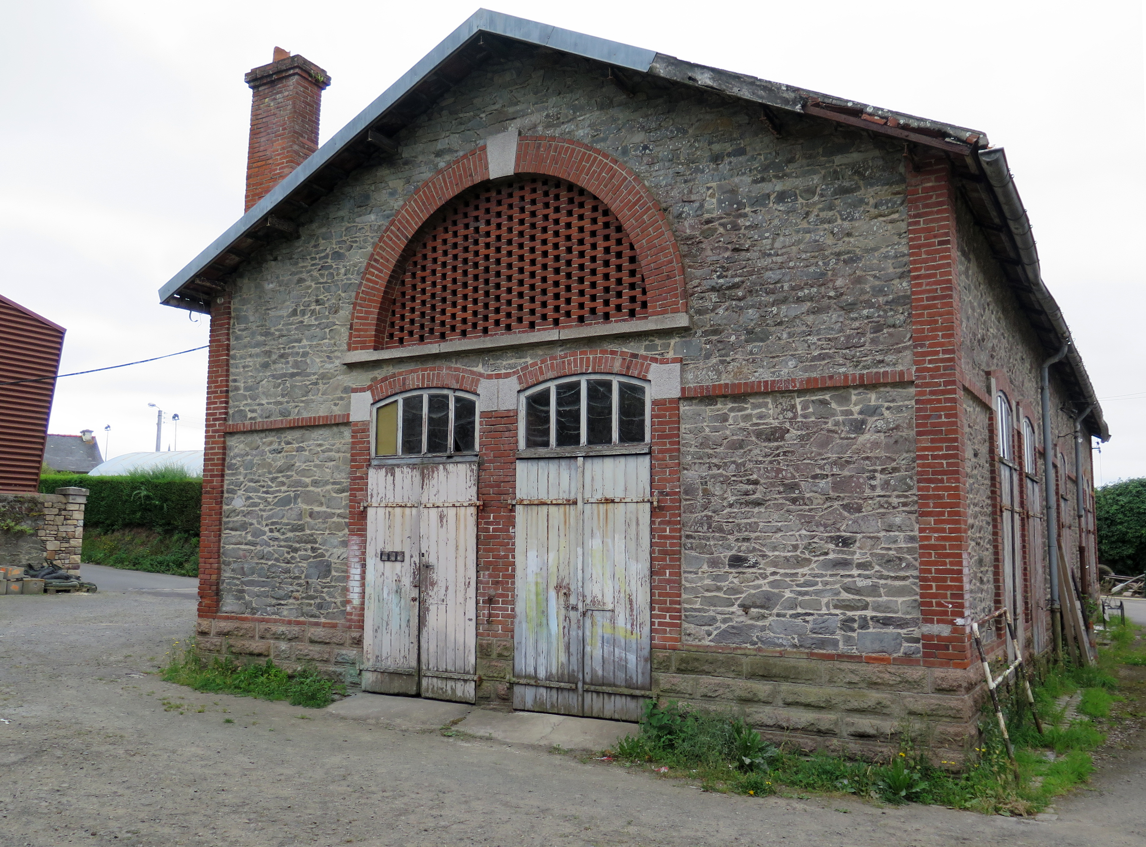 Tréguier, rue du Guindy : abattoir public municipal, façade nord de la halle. Les pignons nord et sud possèdent chacun une double porte surmontée d'une ouverture hémisphérique ajourée en brique permettant l'aération du bâtimentImmatriculation