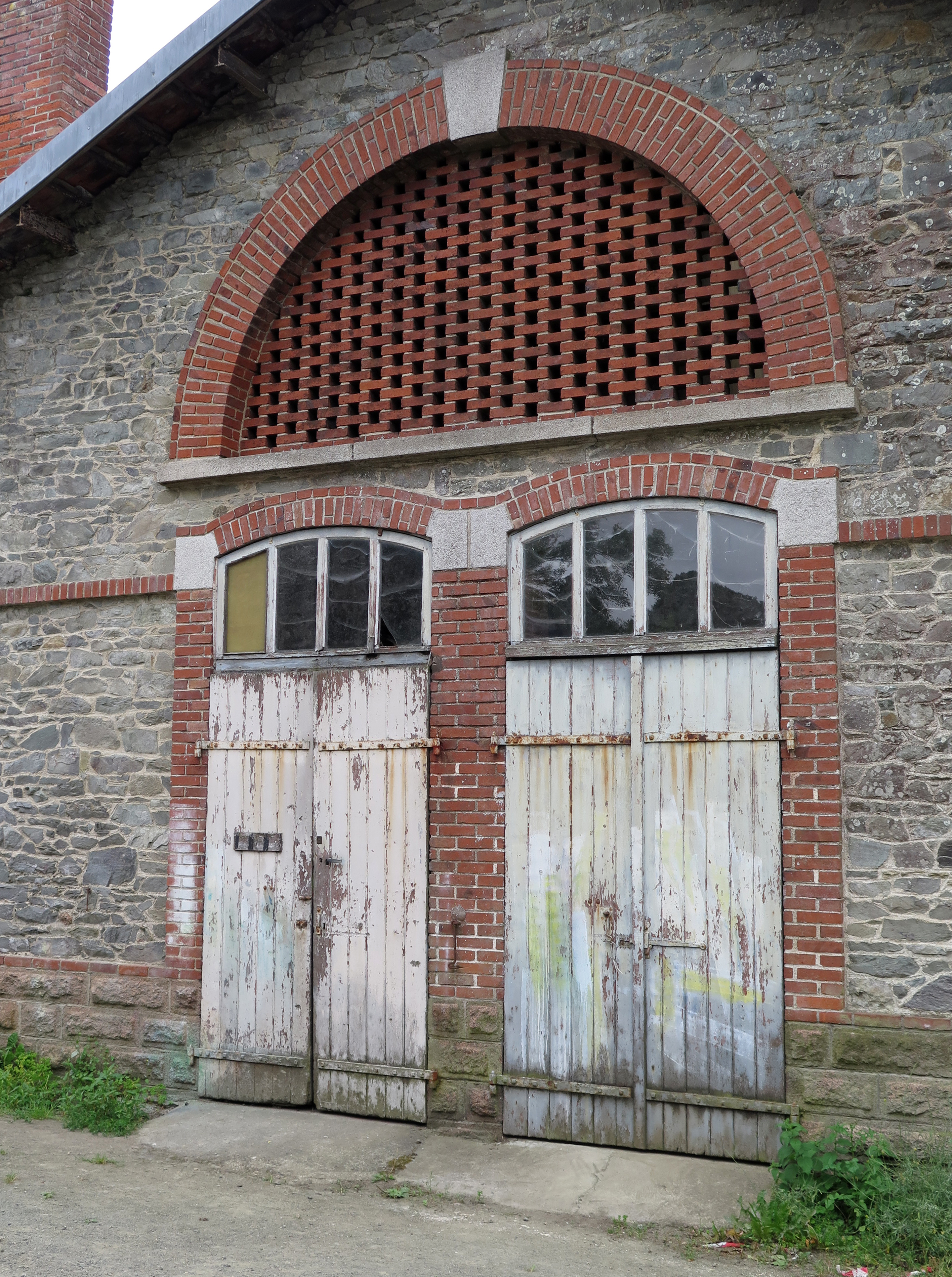 Tréguier, rue du Guindy : abattoir public municipal, façade nord de la halle. Les pignons nord et sud possèdent chacun une double porte surmontée d'une ouverture hémisphérique ajourée en brique permettant l'aération du bâtimentImmatriculation