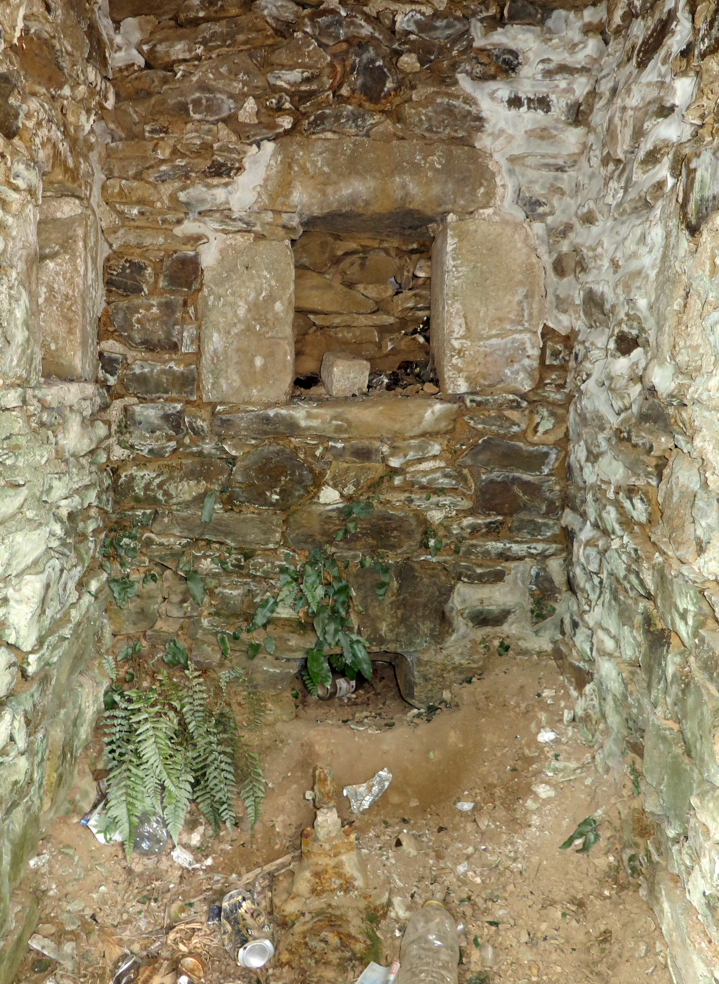Tréguier, venelle Lapie, derrière l'ancien abattoir municipal : ouvrage lié à l'alimentation en eau, vue intérieure. Cet édicule abrite une vanne destinée à purger la conduite d'eau. sur le mur du fond, petite niche à lumièreImmatriculation