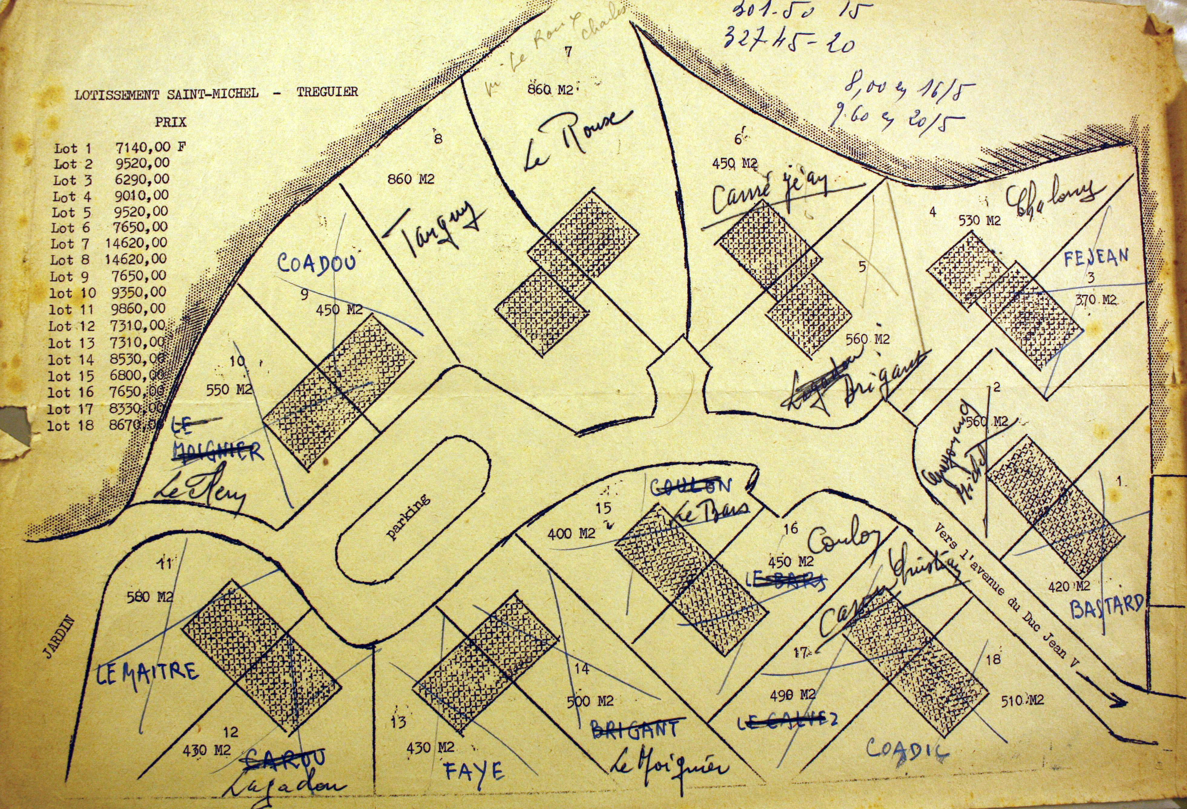 Tréguier : plan et prix de 18 lots du lotissement Saint-Michel, non daté, vers 1970-1974 (Archives municipales de Tréguier)Immatriculation