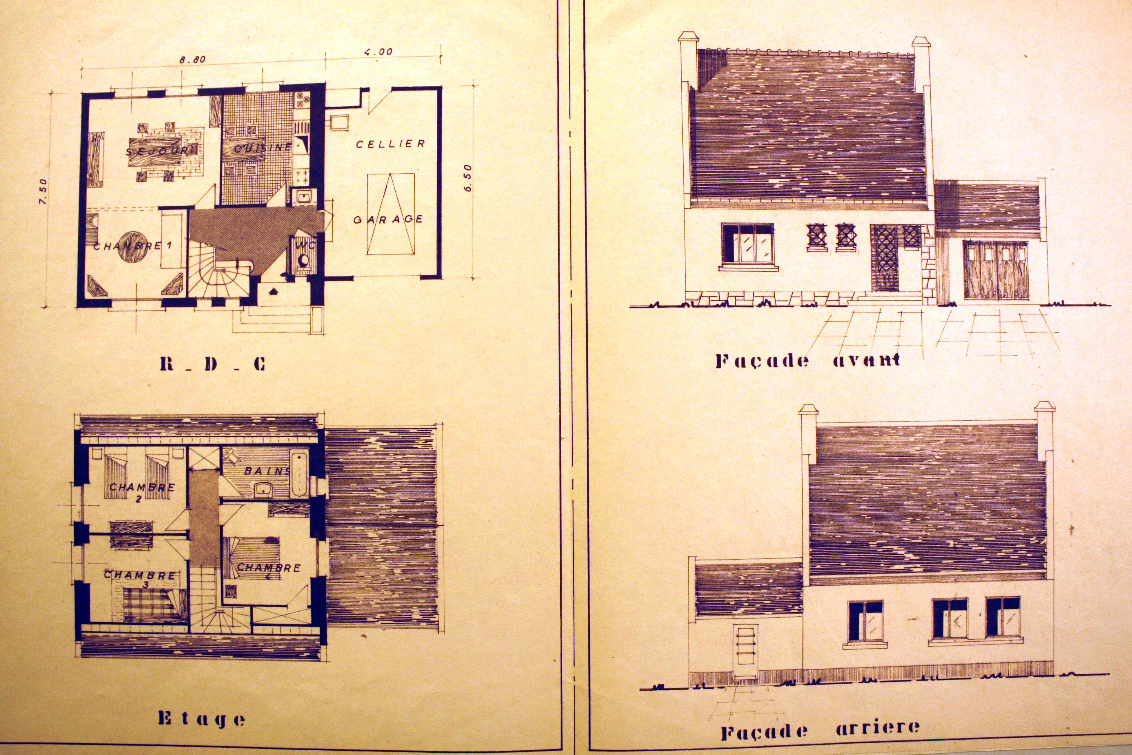 Tréguier : plans et élévations de l'une des maisons proposées pour le lotissement Saint-Michel par la coopérative d'habitat rural du Finistère et des Côtes-du-Nord, modèle Corsen V (Archives municipales de Tréguier)Immatriculation