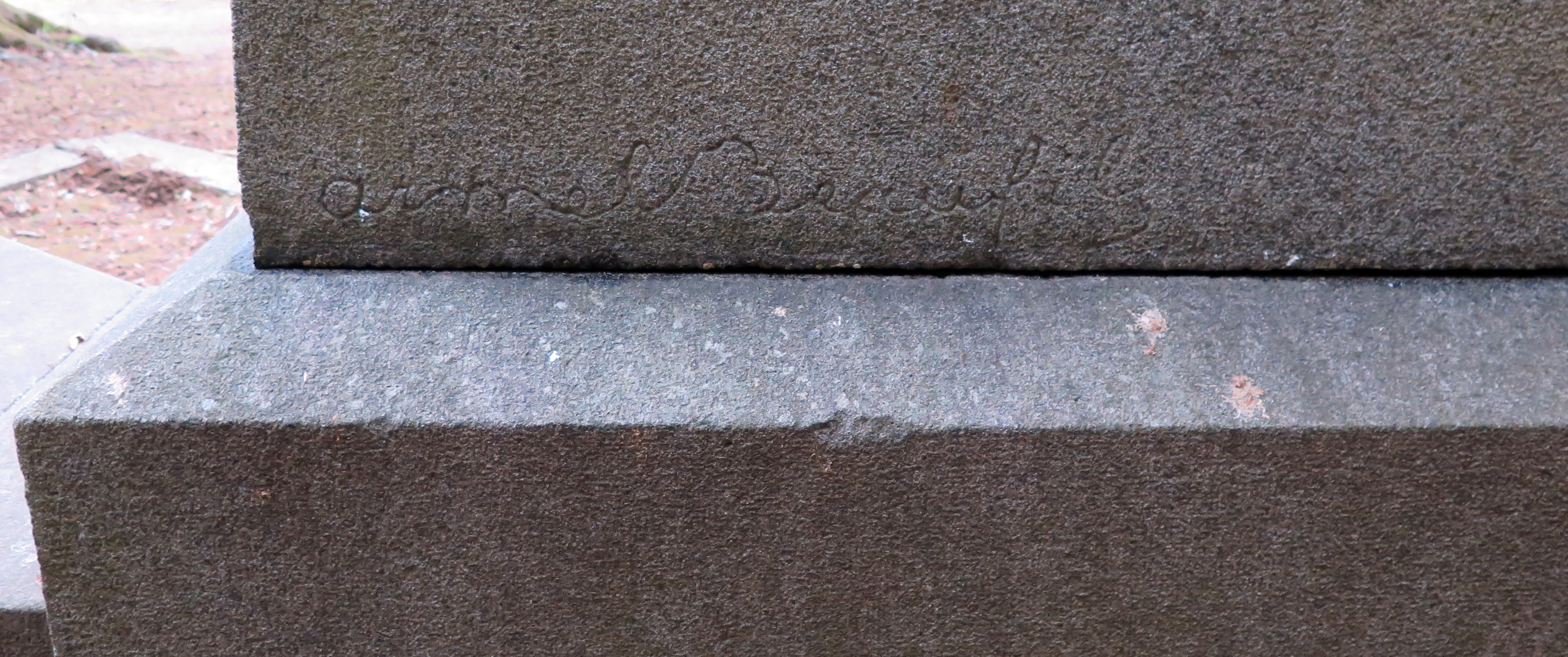 Tréguier, "Bois de l'Évêché" aujourd'hui "Bois du Poète" : détail du monument funéraire et tombe de Anatole Le Braz, signature du sculpteur Armel Beaufils au verso de la stèleImmatriculation