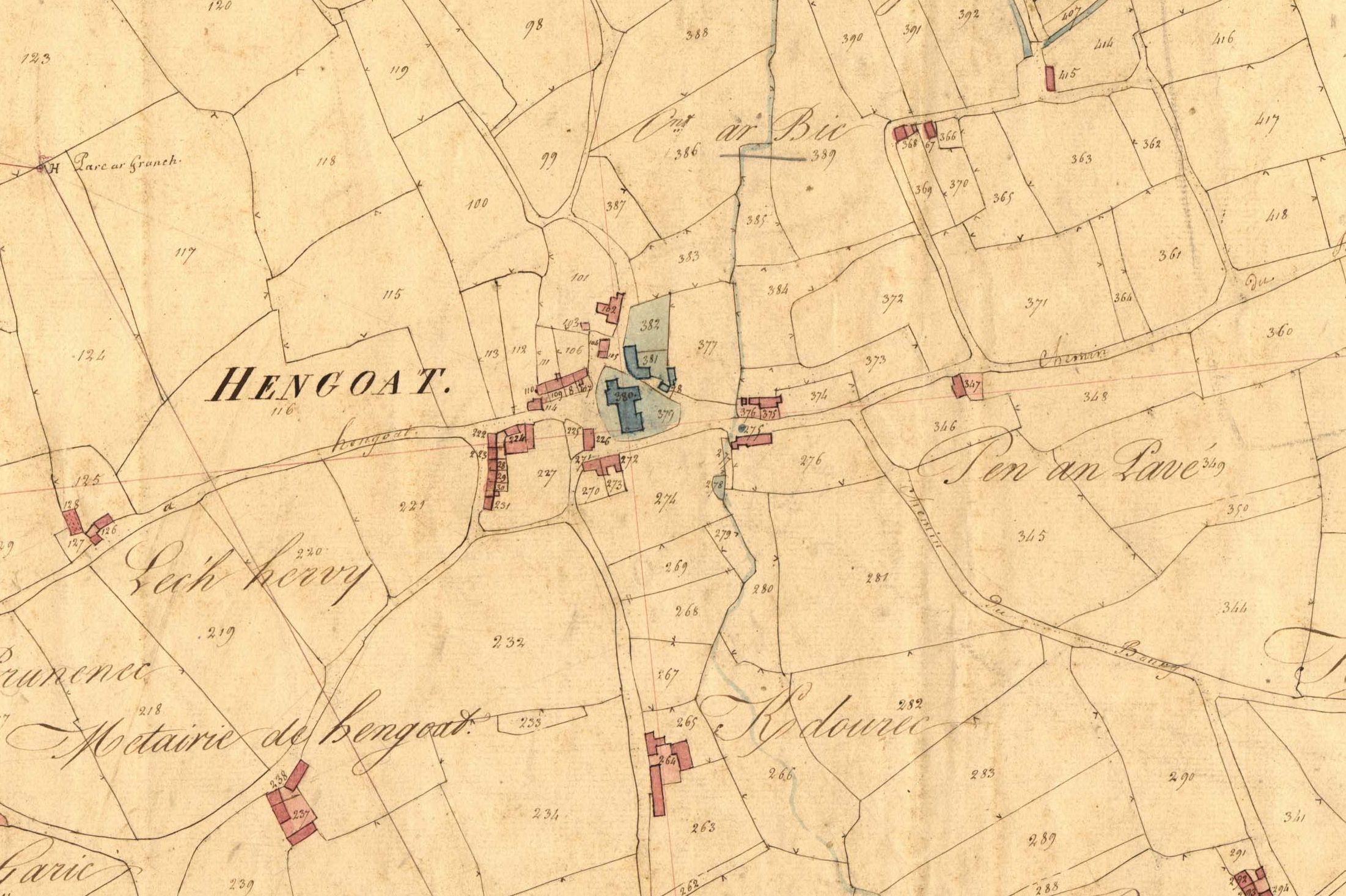 Le bourg en 1835. Extrait du cadastre ancien, section B1 (A.D. 22, série 3P 078)Immatriculation