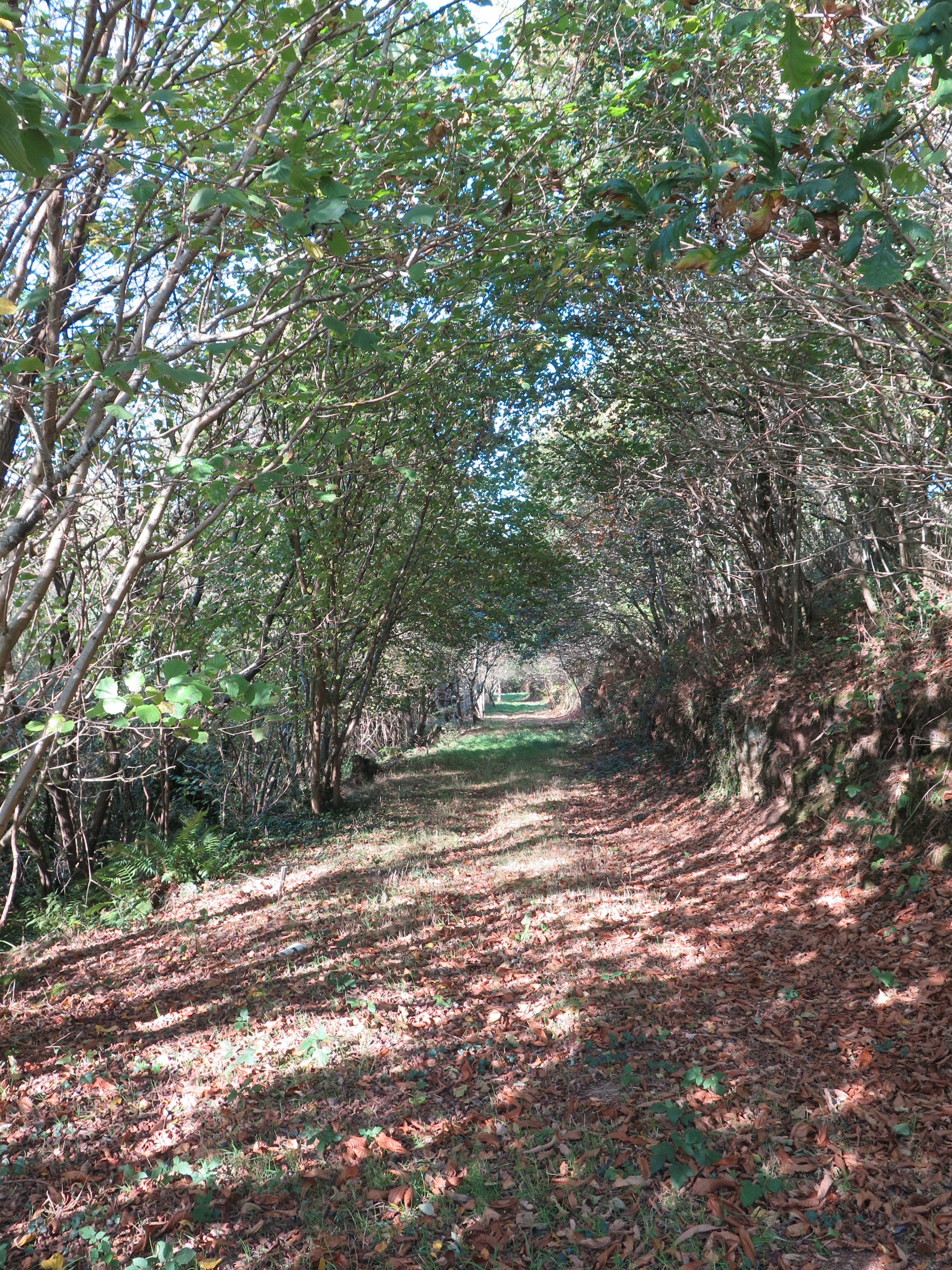 Etang de Bizien (près de ). Chemin ombragé bordé d'un talus. Vue généraleImmatriculation