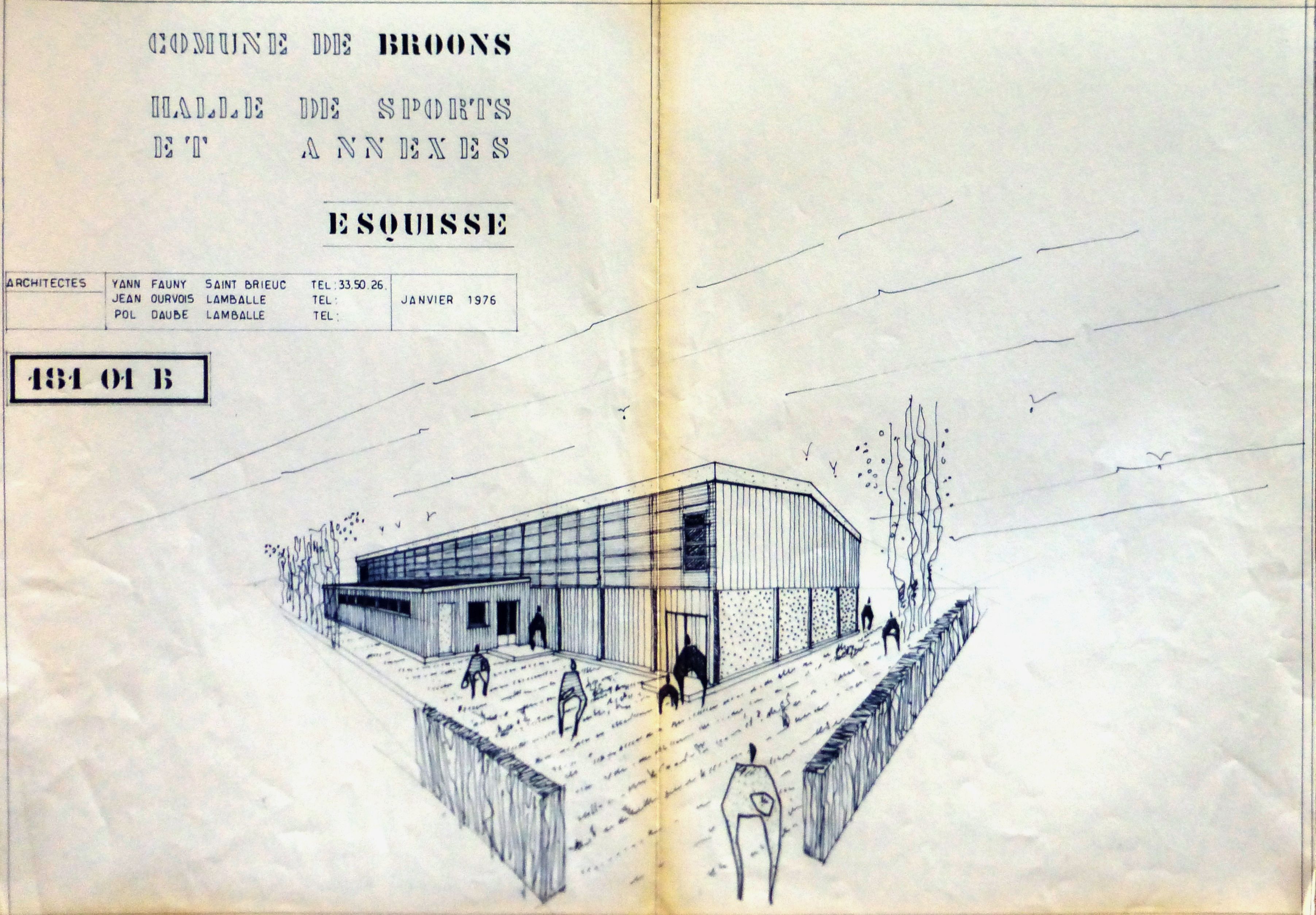 AD Côtes-d'Armor : 1126 W 16. Halle de sports et annexes : esquisse. Y. Fauny, J. Ourvois & P. Daubé, 1976.