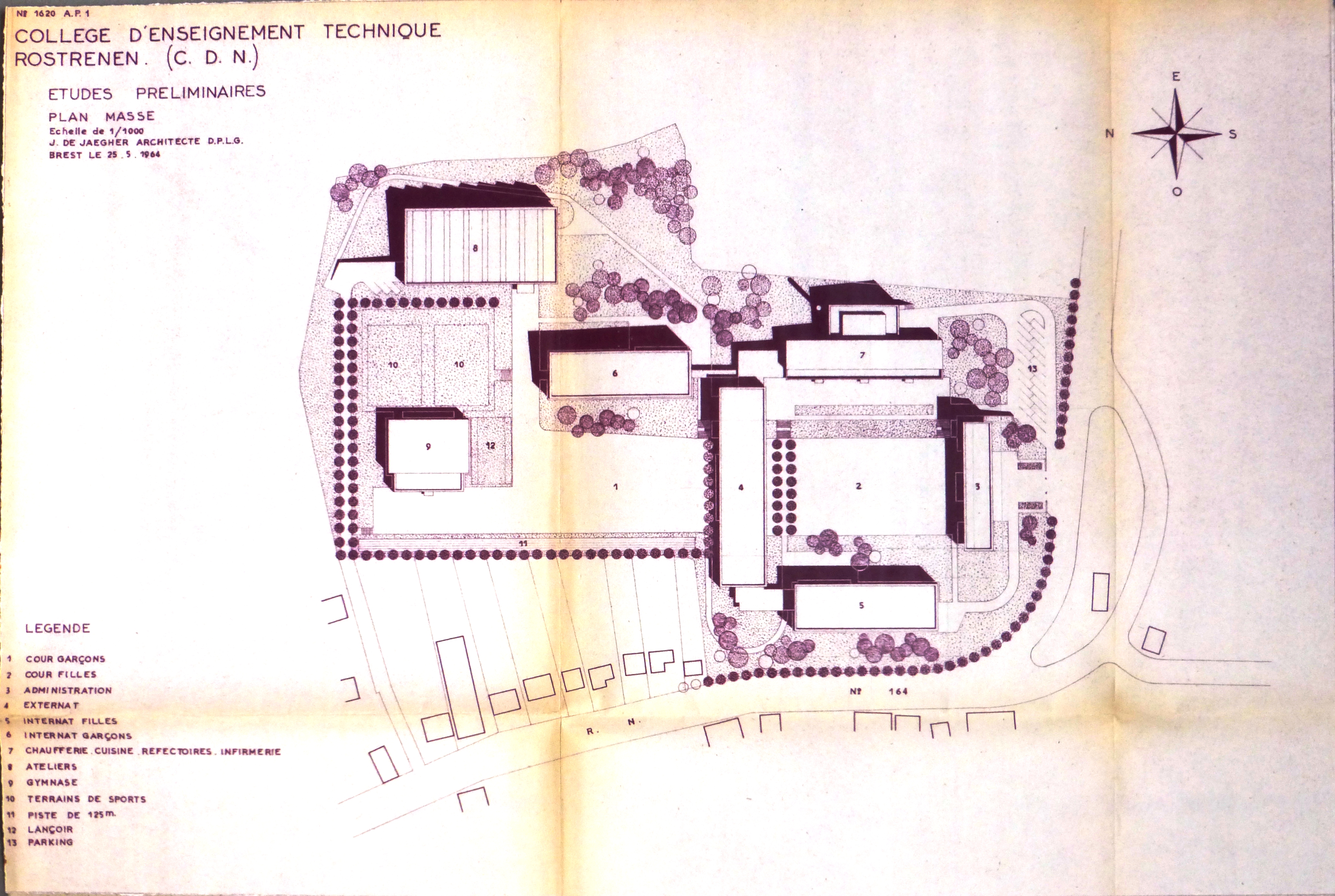 Plan masse, 1964. On note la présence de deux cours, l'une pour les garçons, l'autre pour les filles, et l'intégration d'un gymnase au programme d'ensemble.Immatriculation