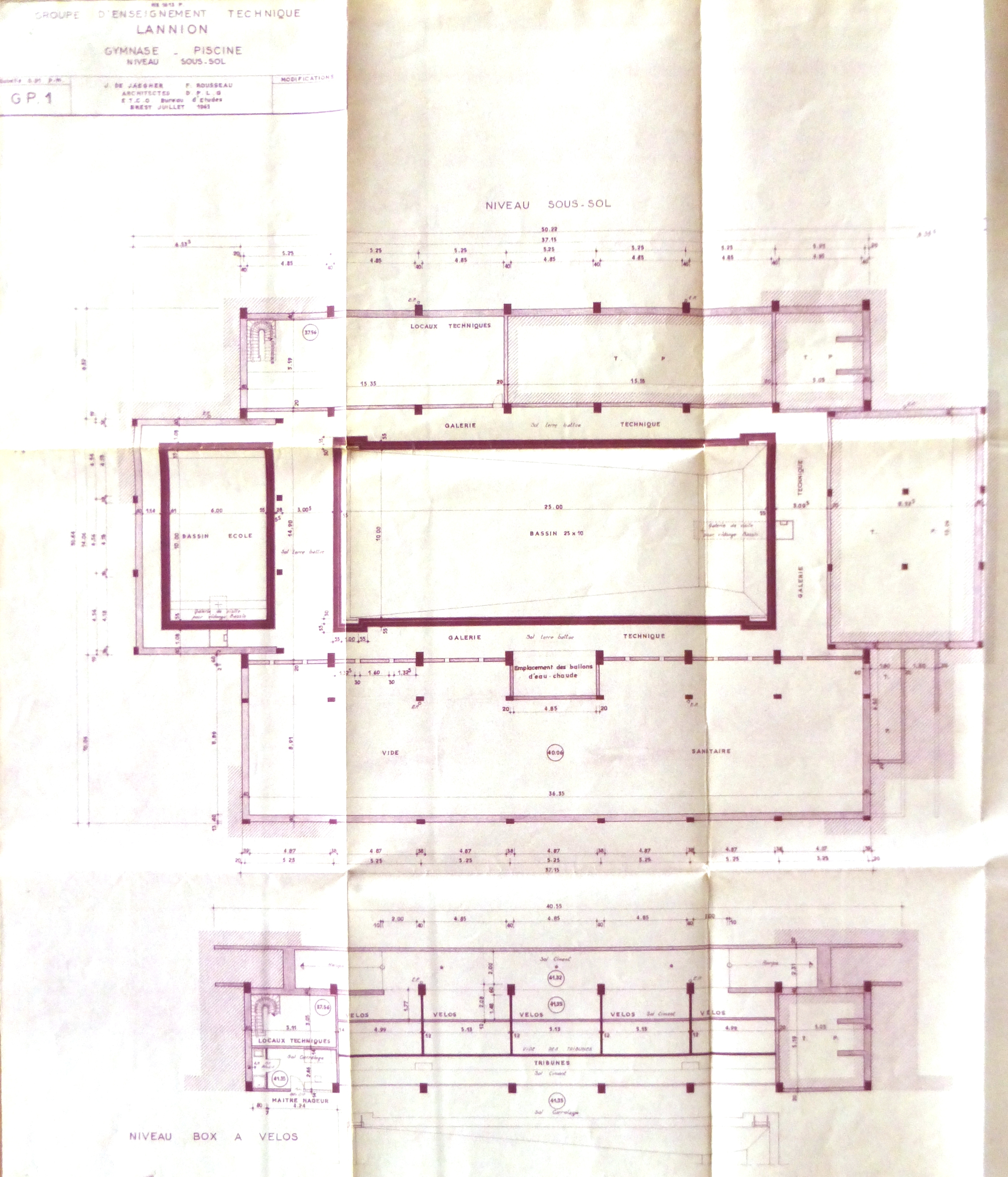 Plan du gymnase-piscine niveau sous-sol et niveau box à vélos.Immatriculation