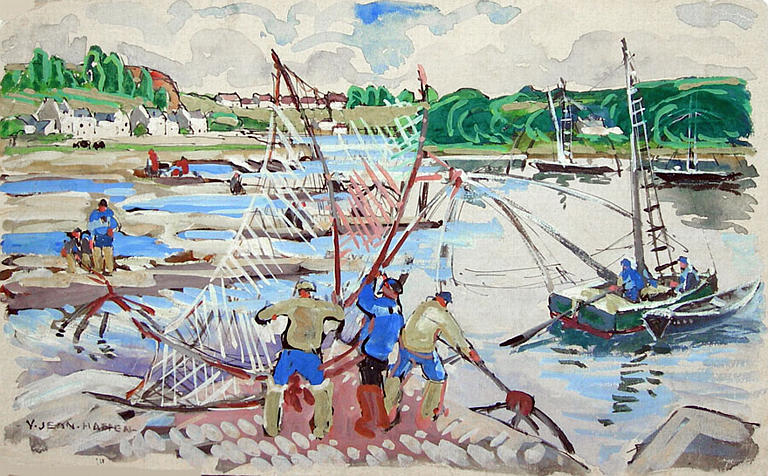 Pêcheurs au carrelet.La Vicomté-sur-Rance, dessin par Yvonne Jean-Haffen. 1960Immatriculation