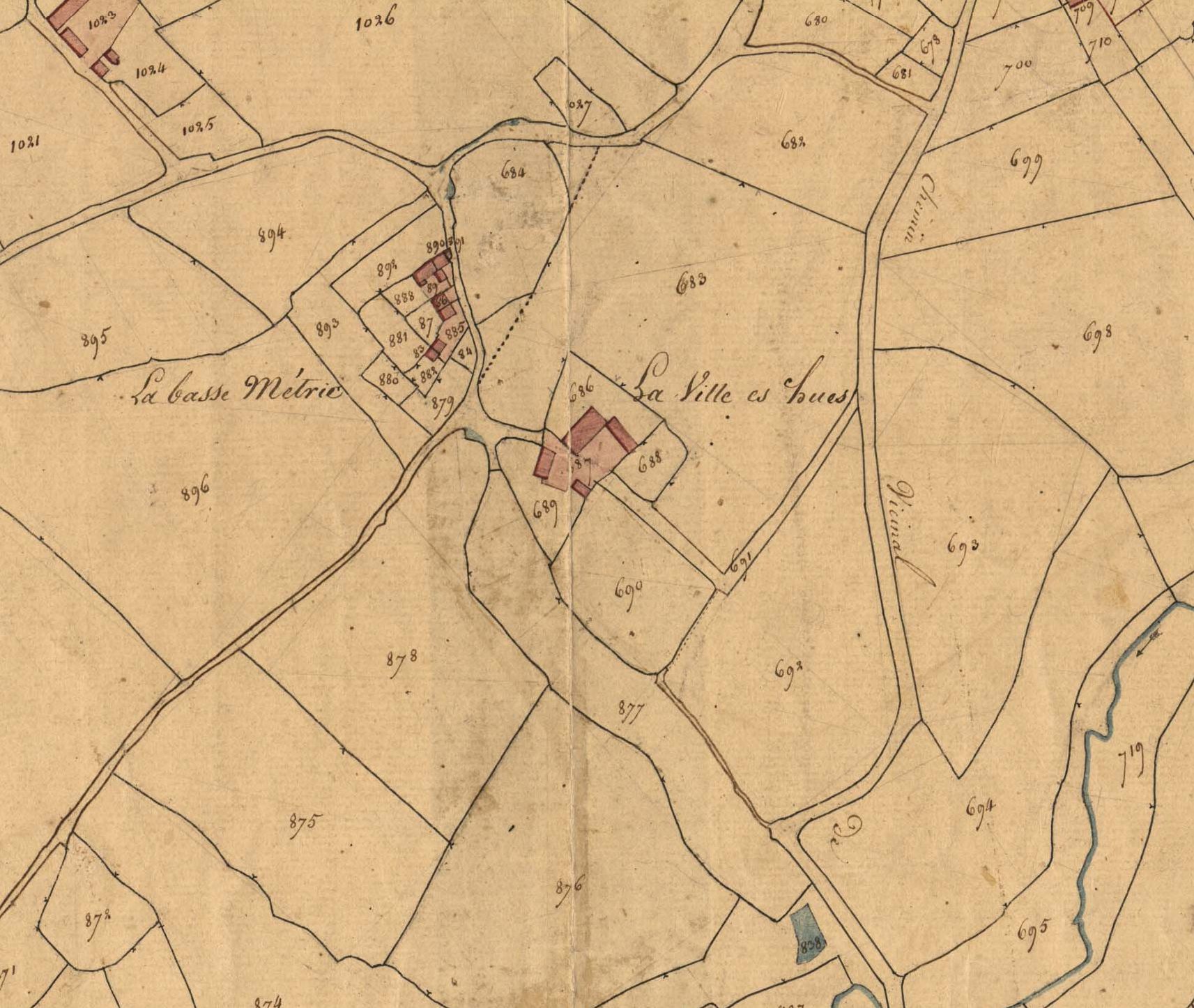 Extrait du cadastre ancien de 1827, manoir de La Ville es Hues, feuille M2Immatriculation