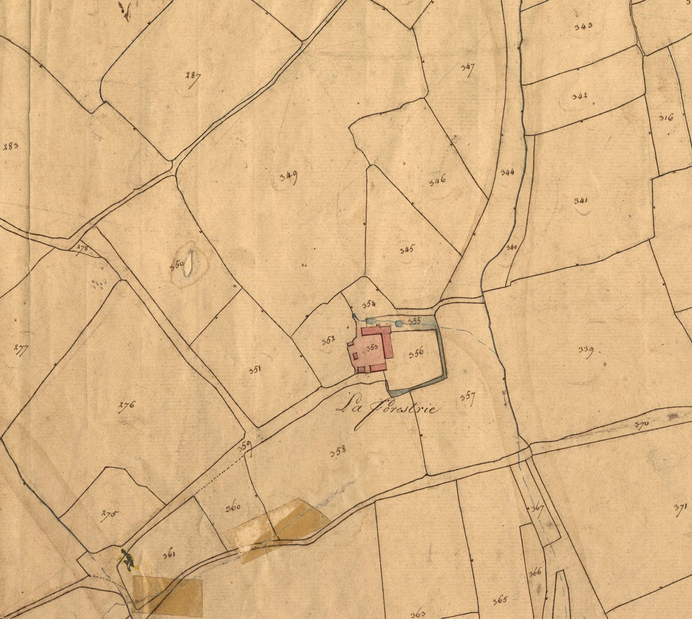 Extrait du cadastre ancien de 1827, manoir de La Foresterie, feuille E1Immatriculation