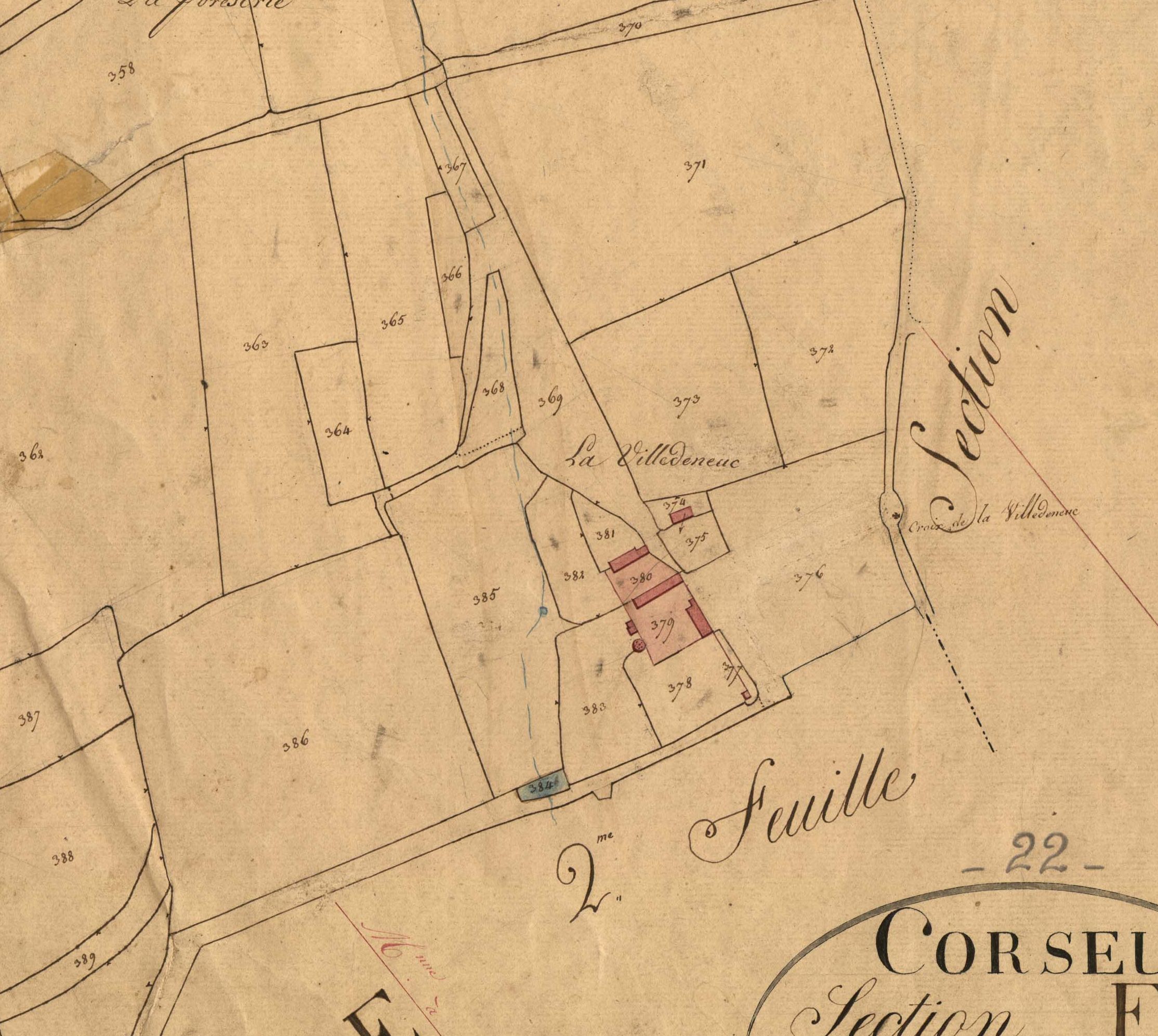 Extrait du cadastre ancien de 1827, manoir de La Villedeneuc, feuille E1Immatriculation