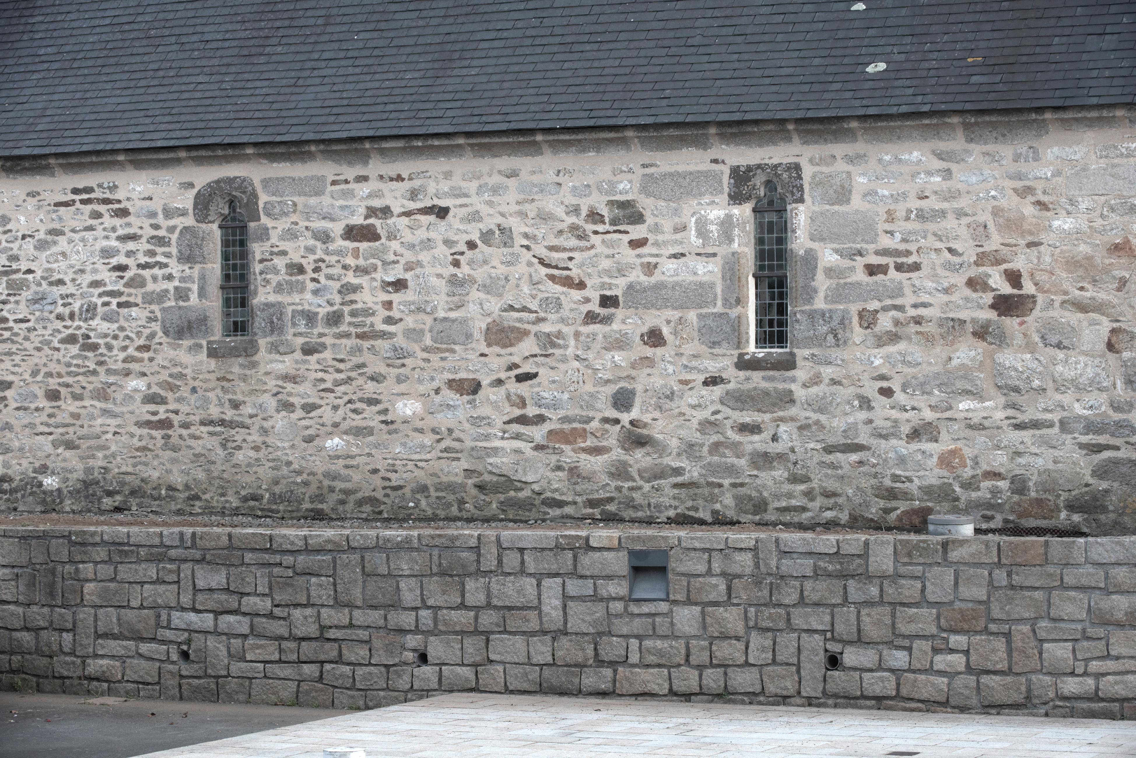 Vue de détail des fenêtres romanes sur le mur nord de la chapelleImmatriculation