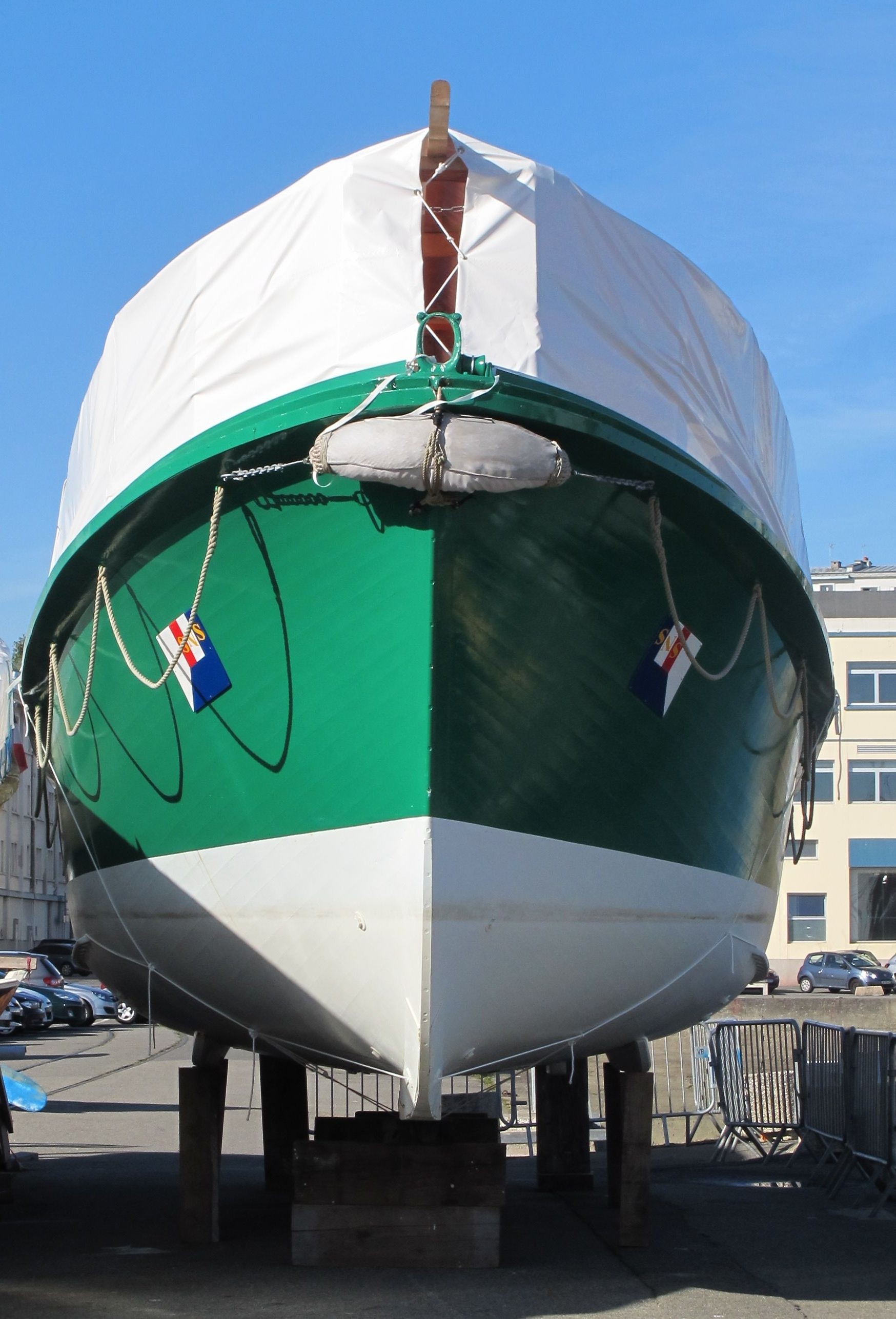 Canot de sauvetage Patron François Morin : proue (bâché devant chantier du Guip)Immatriculation