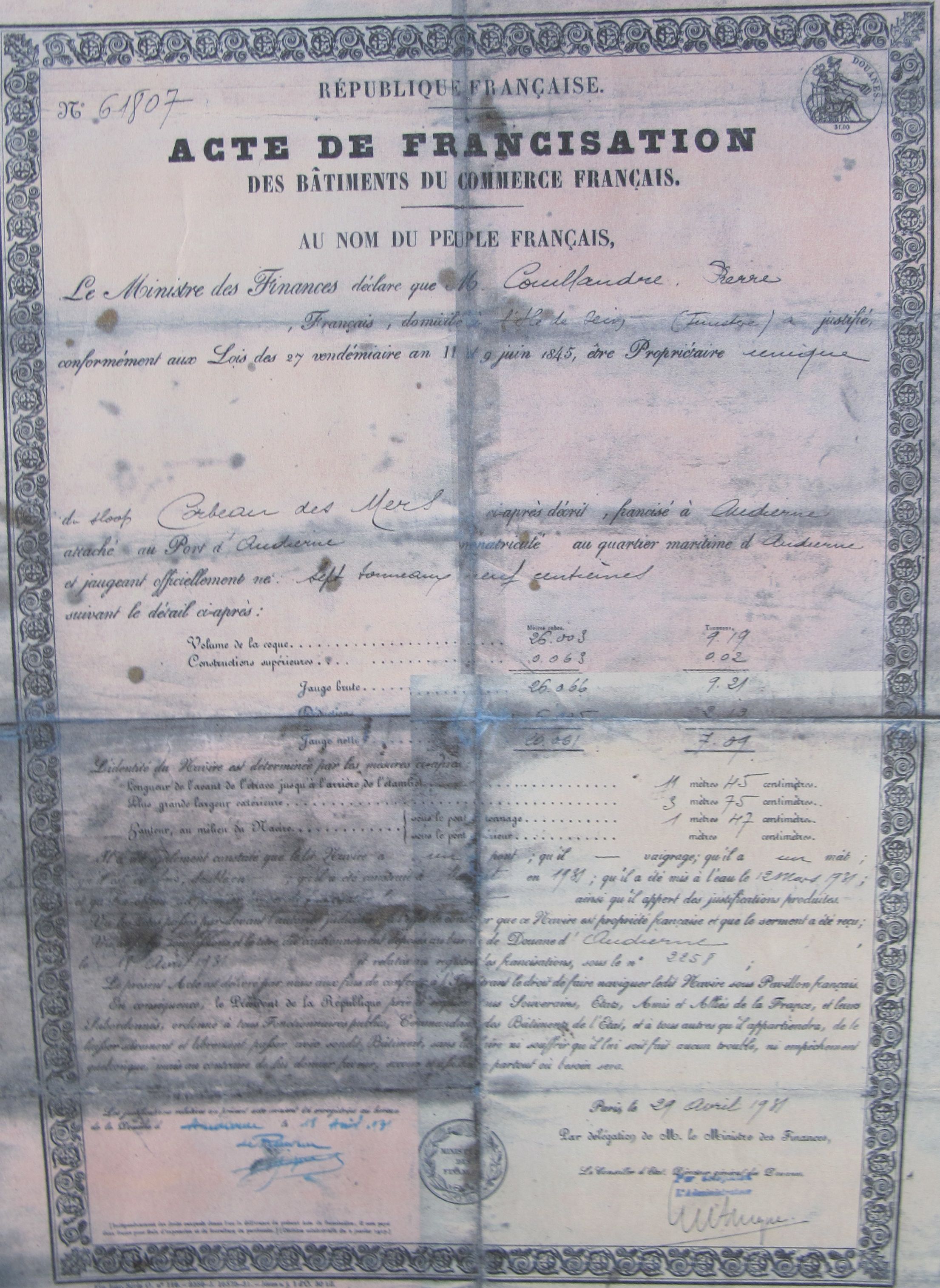 Acte de francisation du Corbeau des Mers, 21 avril 1931 (reproduction)Immatriculation