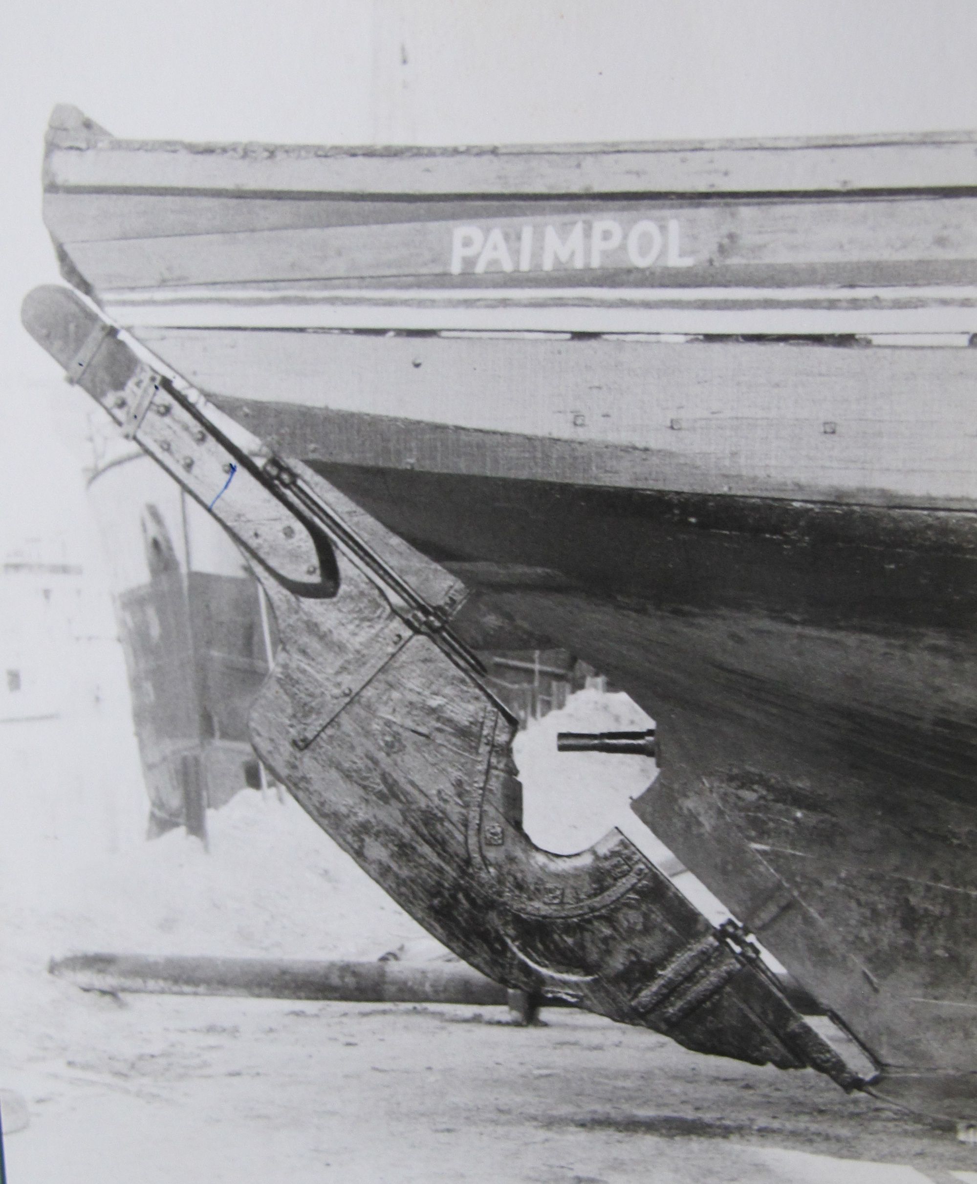 Le Corbeau des Mers, vue rapprochée de la poupe, gouvernail d'étambot (1977)Immatriculation