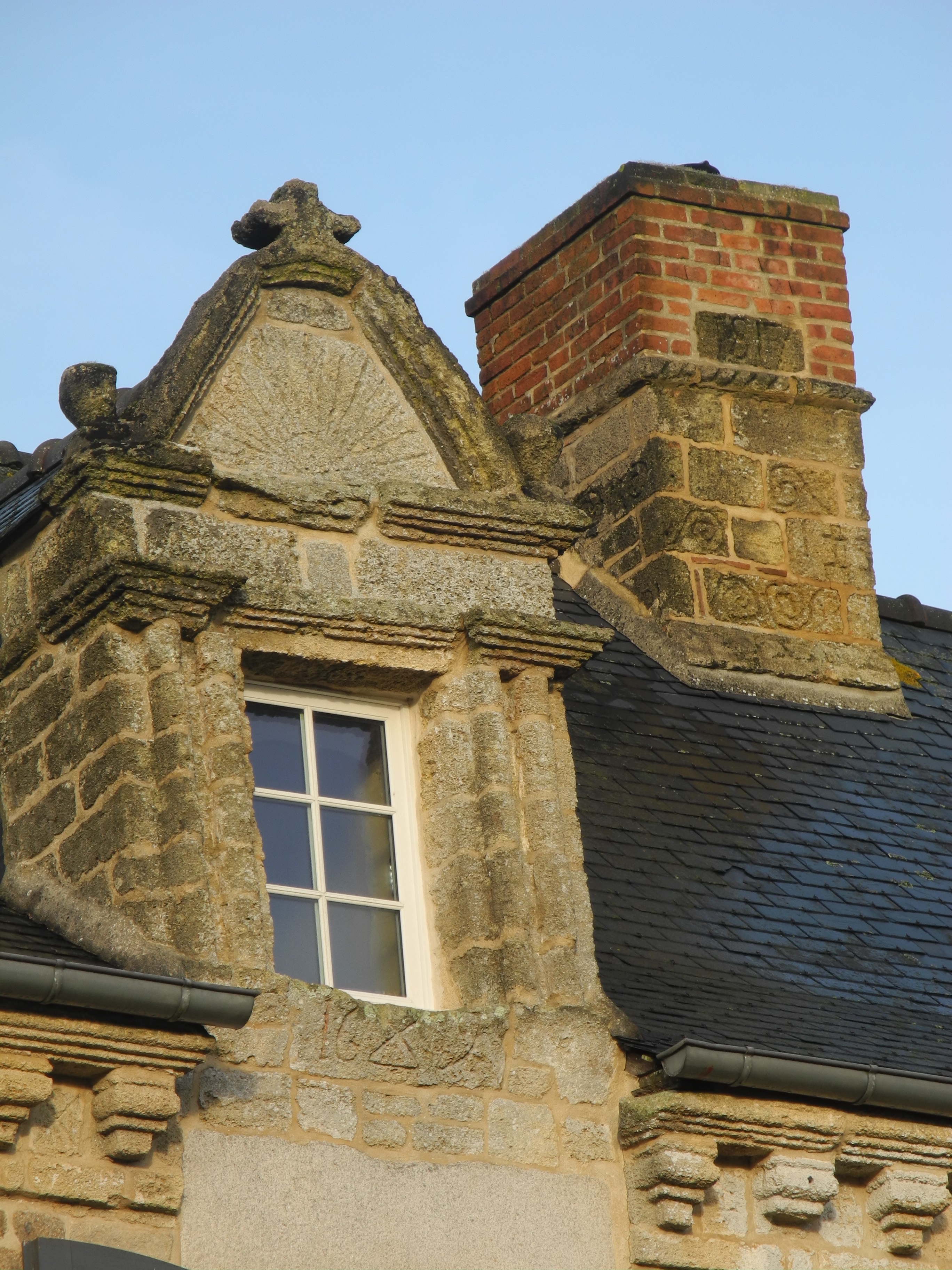 Lucarne datée 1689 et souche de cheminée sculptée.Immatriculation