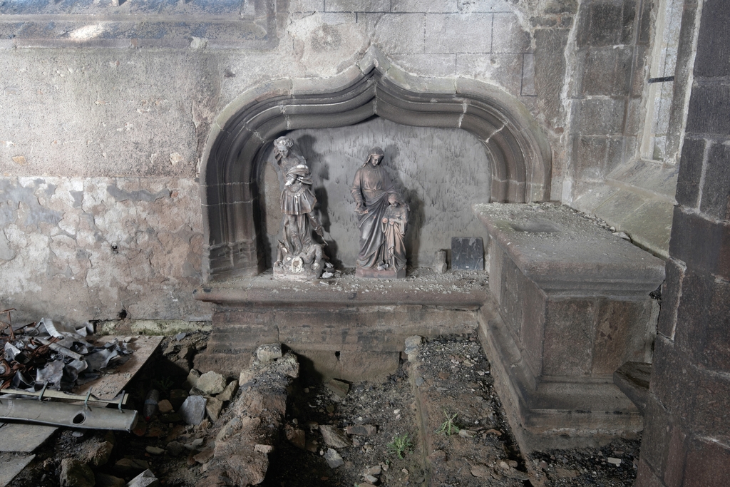 Trémel, le bourg : église paroissiale Notre-Dame, vue intérieure, enfeu du transept nord formant chapelle (après l'incendie le 21 juin 2016)Immatriculation