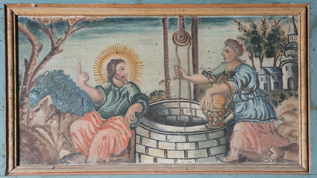 Ensemble de petits tableaux sur le pourtour du lambris de couvrement. Jésus et la samaritaine au puitsImmatriculation