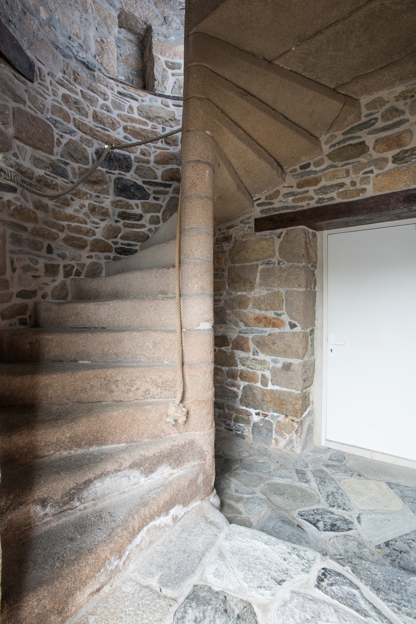 Tréguier, 6 Place du Général de Gaulle : maison d'armateur actuellement "pharmacie des Quais", escalier en vis en pierre de tailleImmatriculation