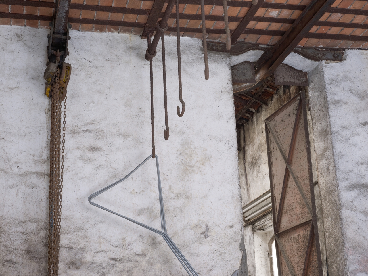 Tréguier, rue du Guindy : abattoir public municipal, halle, vue intérieure, ensemble de crocs de boucher et porte de communicationImmatriculation