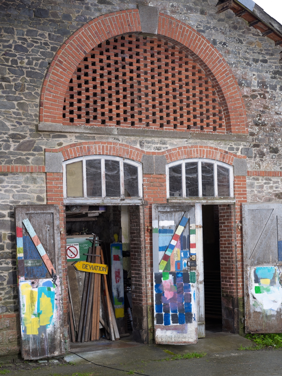 Tréguier, rue du Guindy : abattoir public municipal, façade nord de la halle. Les pignons nord et sud possèdent chacun une double porte surmontée d'une ouverture hémisphérique ajourée en brique permettant l'aération du bâtimentImmatriculation