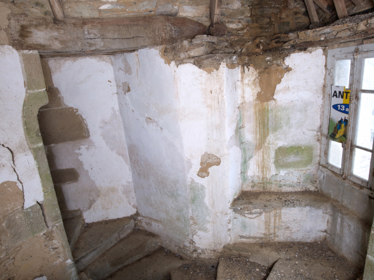 Corps de logis. Escalier en vis en pierre. Deuxième étage, détail de la baie à coussiège offrant une vue sur le Guindy au nord et porte dérobée desservant une chambreImmatriculation