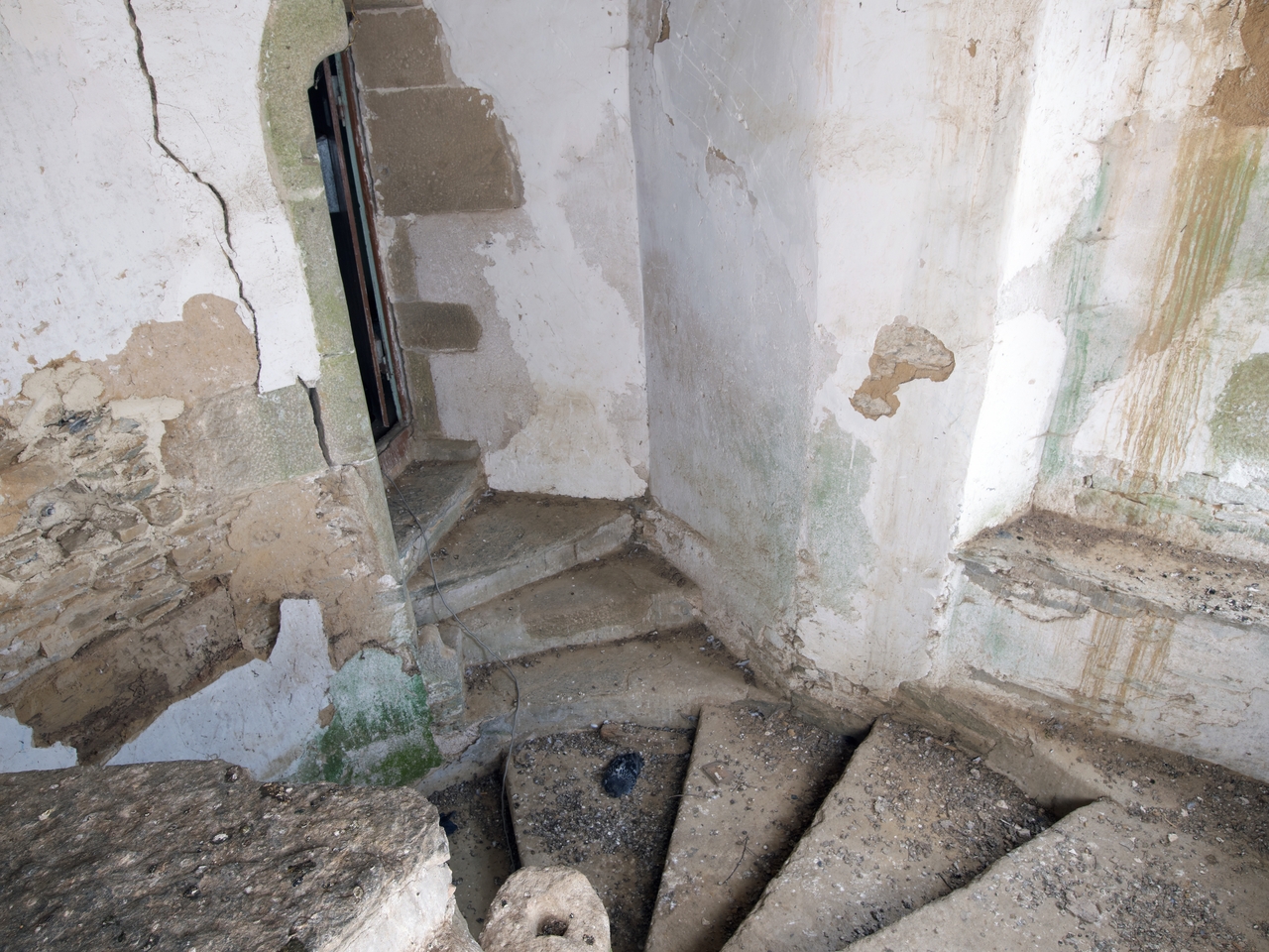 Corps de logis. Escalier en vis en pierre. Deuxième étage, porte dérobéedonnant sur une chambre. A droite, baie à coussiège offrant une vue sur le Guindy au nordImmatriculation