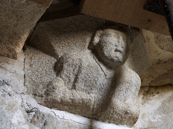 Corps de logis. Escalier en vis en pierre. Palier du premier étage, détail d'une console sculptée sous une marcheImmatriculation