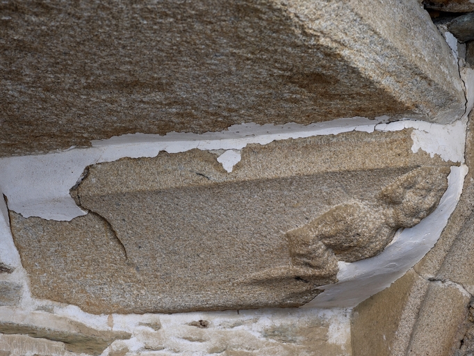 Corps de logis. Escalier en vis en pierre. Palier du premier étage, détail d'une console sculptée sous une marcheImmatriculation