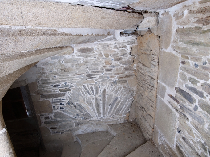 Corps de logis. Escalier en vis en pierre. Détail de l'arc de décharge placé au-dessus de la porte d'accès à la cour nord. A droite porte bouchée donnant autrefois sur la partie est aujourd'hui détruiteImmatriculation