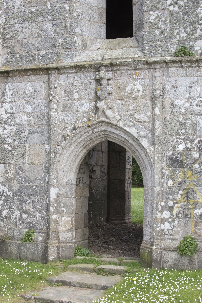 Tréguier : tour Saint-Michel, porte ouest à l'ornementation gothique (pinacles, arcade en accolade, choux frisés, fleuron et armoiries)Immatriculation