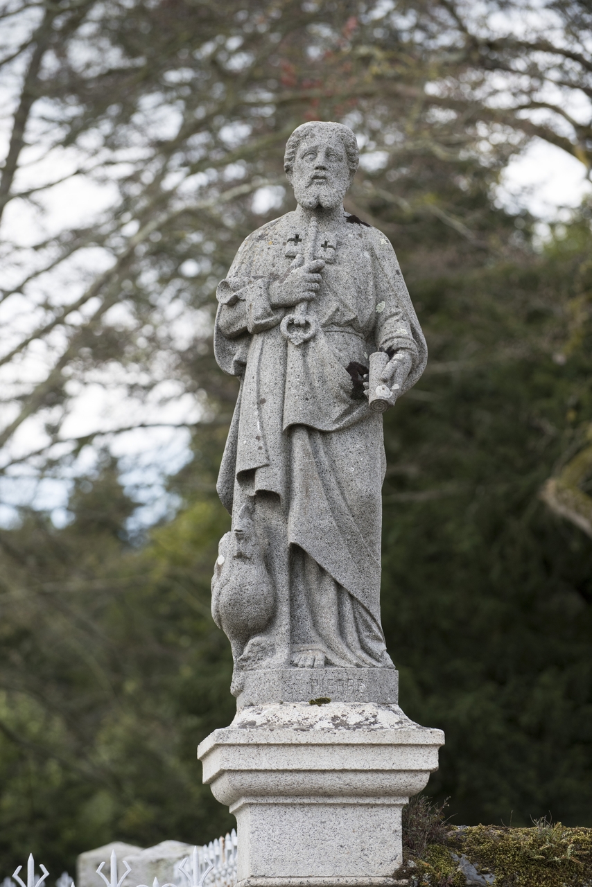 Tréguier, rue Marcellin Berthelot - Parc de la Baronnais : calvaire de Réparation, détail de la statue de saint Pierre avec ses attributs (clé et coq notamment)Immatriculation