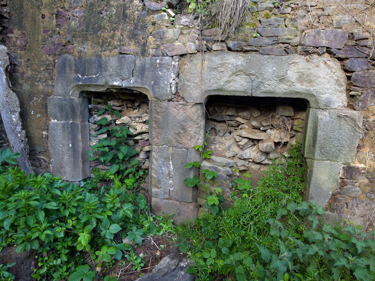 Poullévénez. Ancienne ferme ruinée, 1ère moitié du 16e siècle. Façade est. Détail des portes jumelées bouchées (ancien accès à la tour d'escalier disparue)Immatriculation