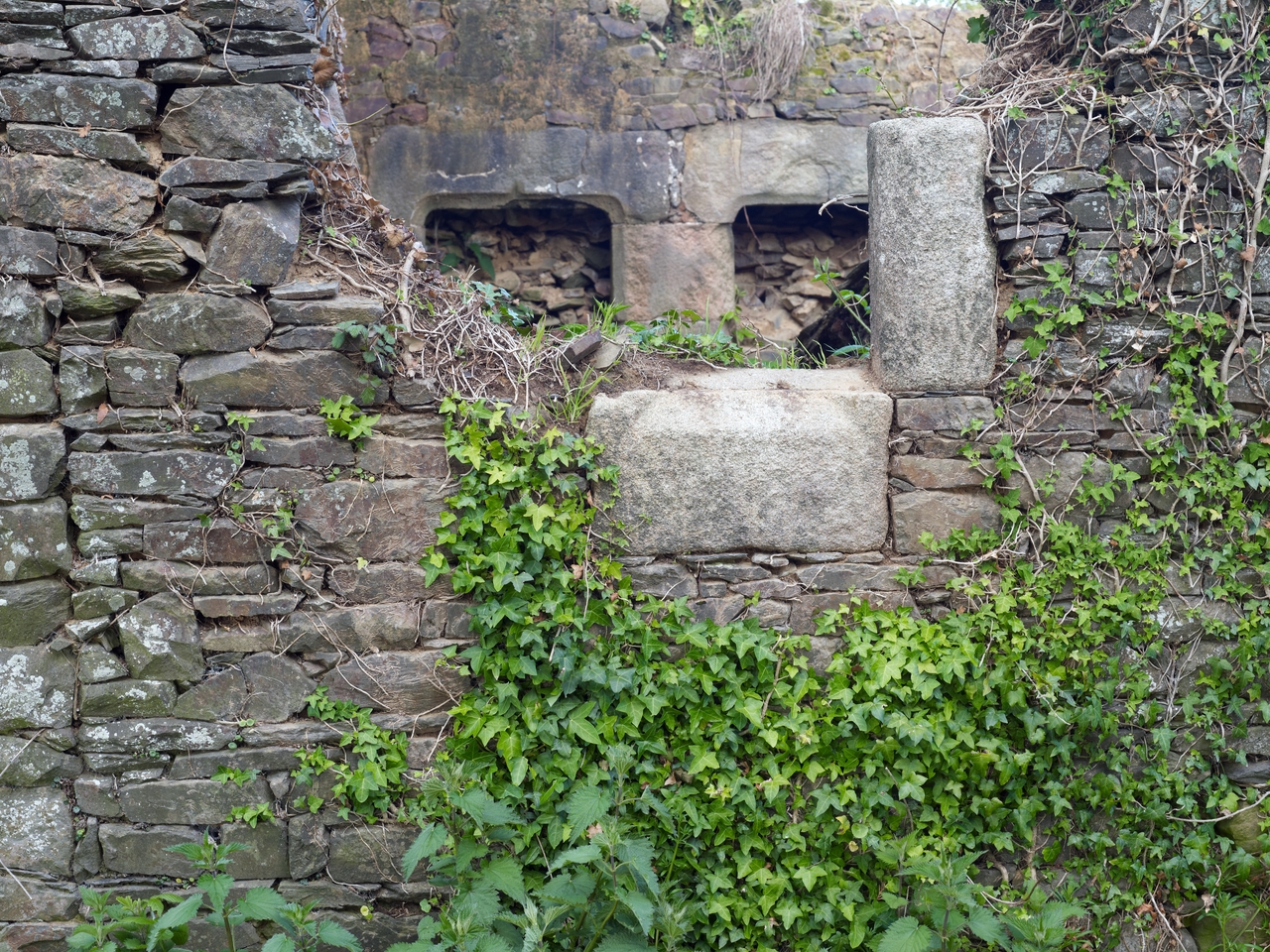 Poullévénez. Ancienne ferme ruinée, 1ère moitié du 16e siècle. Portes jumelées vues depuis une baie de la façade ouestImmatriculation