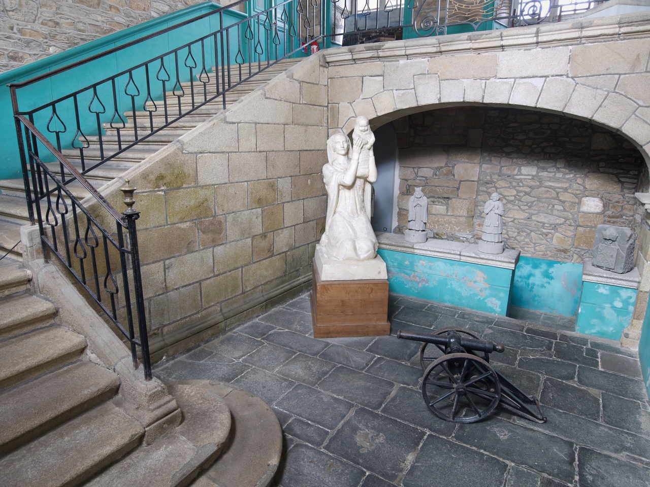 Tréguier, boulevard Anatole Le Braz : palais épiscopal aujourd'hui mairie et bibliothèque, corps principal, vestibule et escalier d'honneur. Dans le vestibule sont présentés différents objets : statue de femme avec jeune enfant, canon d'apparat (ou de fête), statues de saints et armoiries d'évêqueImmatriculation
