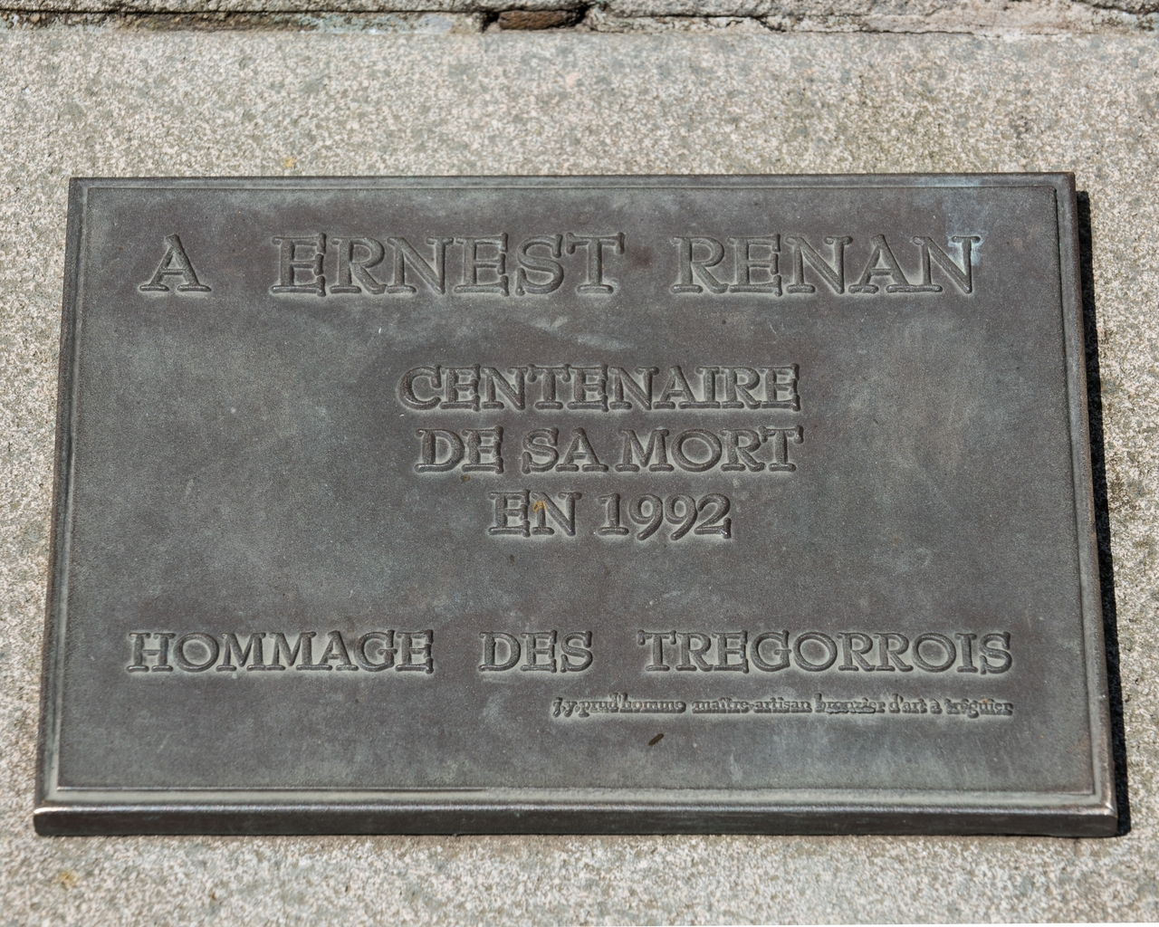 Tréguier, place du Martray : statue d'Ernest Renan et de la déesse Pallas Athéna, détail de la plaque commémorative en bronze. Sur la plaque, on peut lire "A Ernest Renan / centenaire / de sa mort / en 1992 / Hommage des Trégorrois / J-Y Prud'homme maître artisan bronzage d'art à Tréguier"Immatriculation